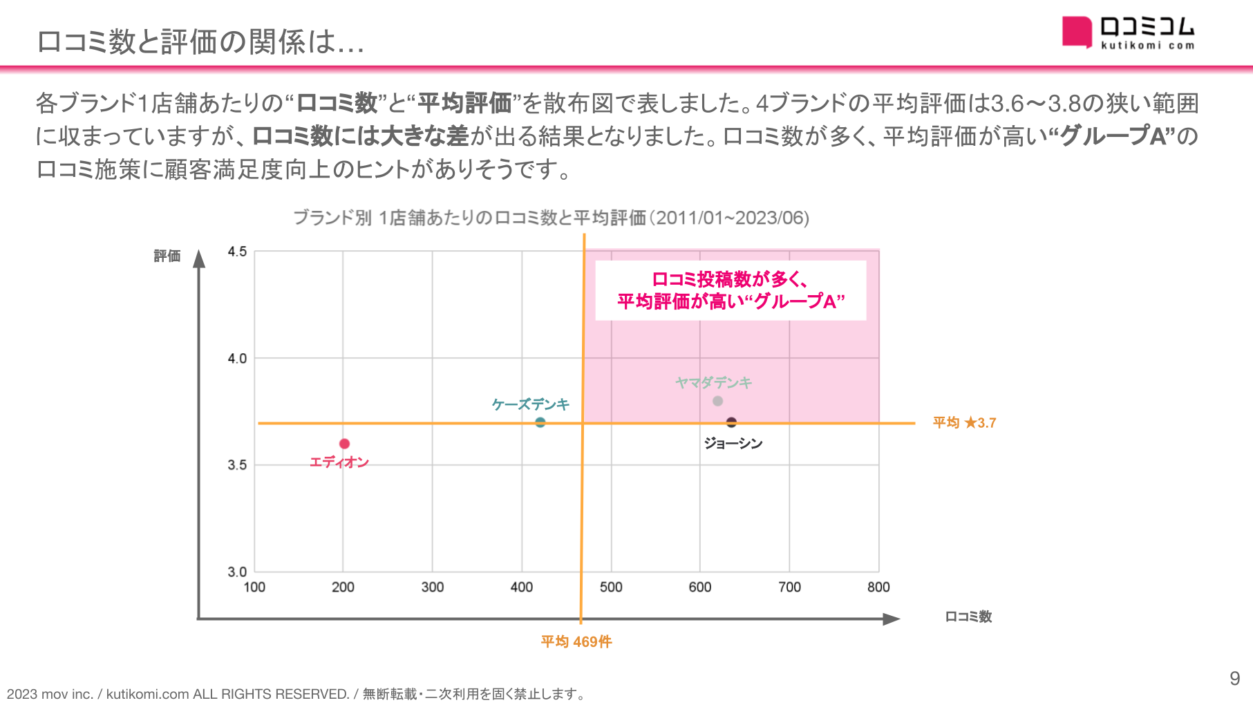 各ブランド1店舗あたりの“口コミ数”と“平均評価”を散布図で表しました。4ブランドの平均評価は3.6~3.8の狭い範囲に収まっていますが、口コミ数には大きな差が出る結果となりました。口コミ数が多く、平均評価が高い“グループA”の口コミ施策に顧客満足度向上のヒントがありそうです。