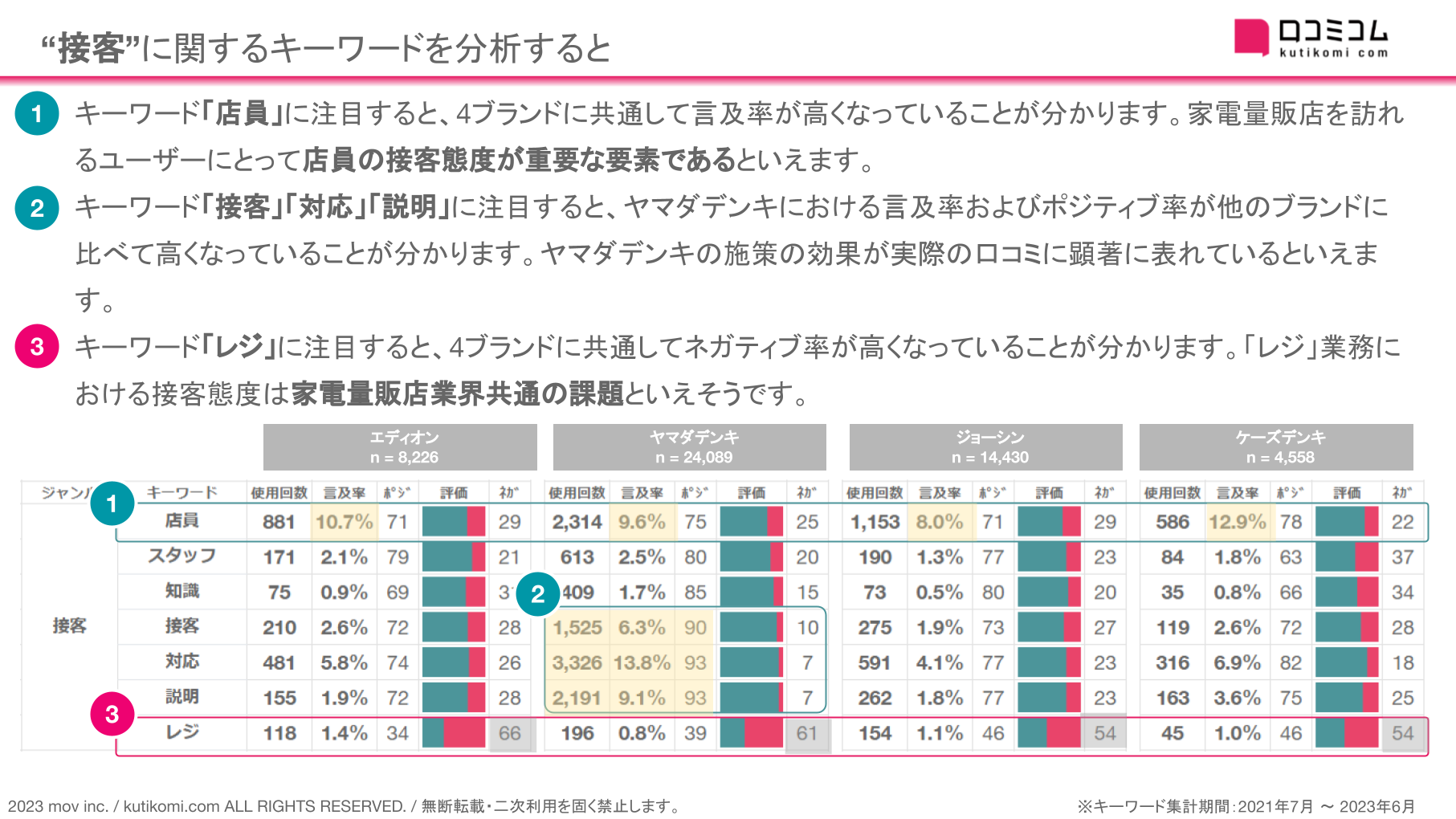 キーワード「接客」「対応」「説明」に注目すると、ヤマダデンキにおける言及率およびポジティブ率が他のブランドに比べて高くなっていることが分かります。ヤマダデンキの施策の効果が実際の口コミに顕著に表れているといえます。