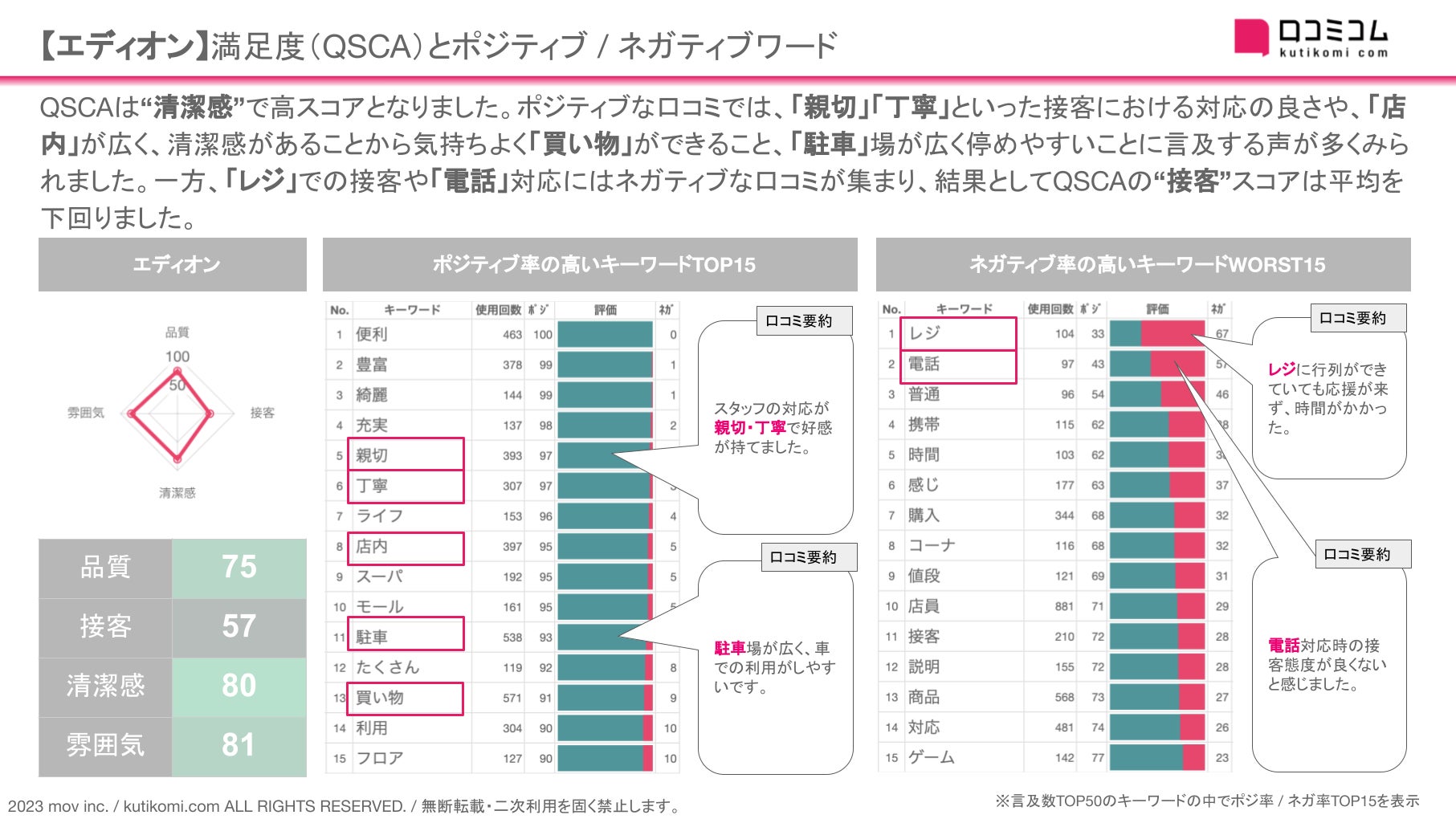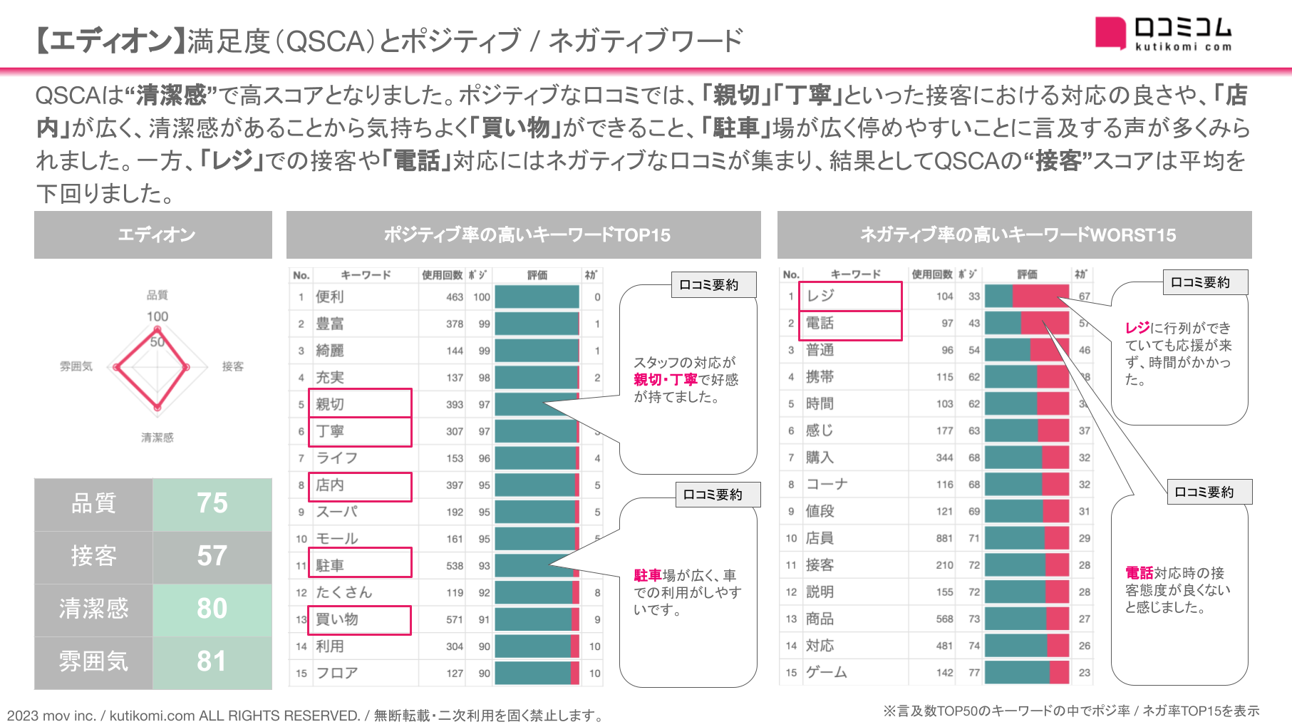 今回は、このAI解析を用いて【エディオン】 のQSCA・ポジ / ネガキーワードを確認しました。