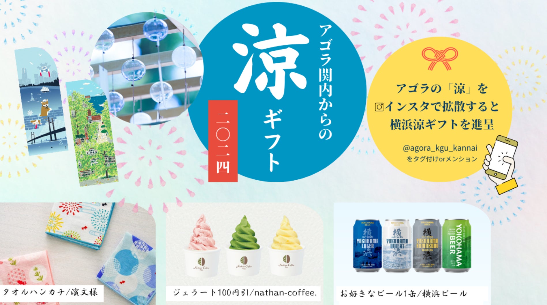 プロジェクト期間中、AGORA KGU KANNAIでは「横浜涼ギフト」キャンペーンを実施します。AGORA KGU KANNAIの公式Instagramアカウントをフォローし、施設内で「涼」をテーマにした写真を撮影して投稿していただくと、濱文様様の和タオルやNathan-Coffee 1884様のジェラート割引券、横浜ビール様のビール缶など、横浜を代表するアイテムをプレゼントいたします。