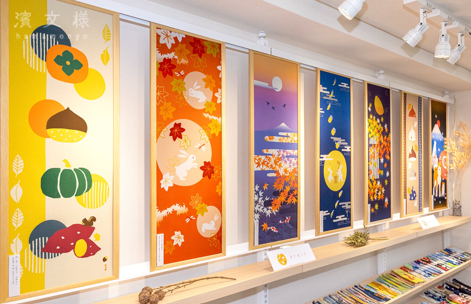 「濱文様」の「絵てぬぐい」は、日本の美しい季節の風景を、日本伝統テキスタイルである「てぬぐい」の上に表現した製品です。専用の額に入れて飾ることで、日本の四季が持つ独特の風情や美しい情景を感じ、楽しむことができます。