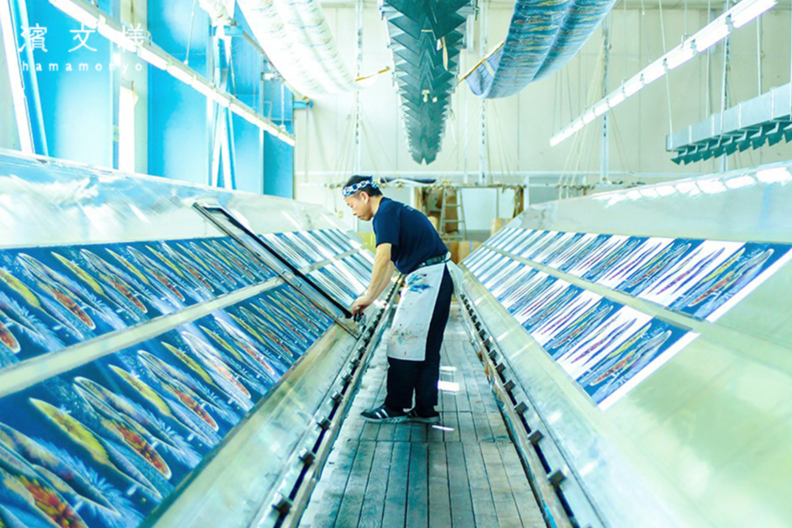 「濱文様(はまもんよう)」は1948年に横浜市で生まれたブランドで、「横浜捺染(なっせん)」と呼ばれる染め技術を用い、色あざやかな発色が特徴です。てぬぐいや風呂敷など和のテキスタイルでありながら、横浜らしい遊び心や情緒にあふれた現代のシーンにもマッチする新しいテキスタイルデザインを生みだし続けています。