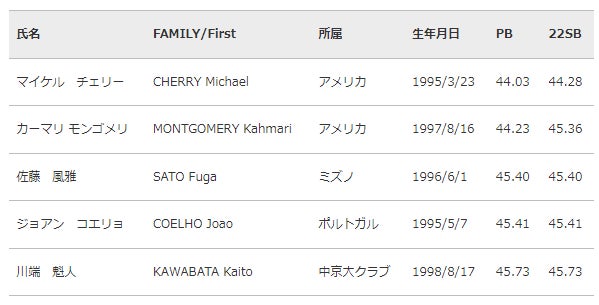 日本からは、オレゴン2022世界選手権4x400mリレーにおいてアジア記録/日本記録(2分59秒51)で4位入賞を果たした佐藤風雅(ミズノ)、川端魁人(中京大クラブ)が出場予定です。