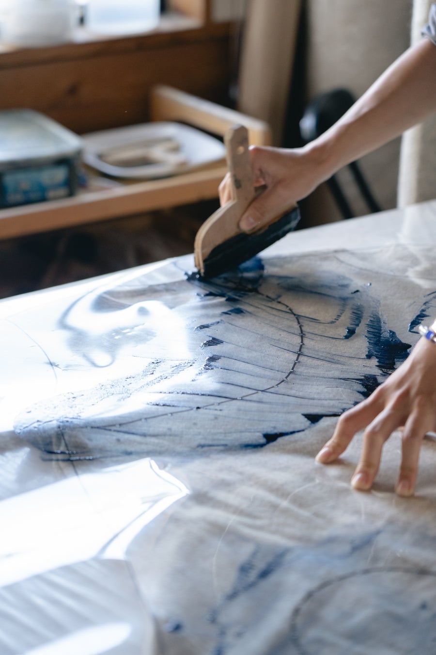 会期中、地階のアーツアンドカルチャーの中央「時の舞台」で、絞り染めのプロセスを表現した展示を行い、絞り染めを完成させていく中の「絵擦り」という工程において、お客様に参加していただくインスタレーションを開催します。お客様にはシルクスカーフを作成していただき、会期中は会場に展示いたします。会期終了後、「suzusan」の職人が有松の工房で仕上げを行い、お納めいたします。
