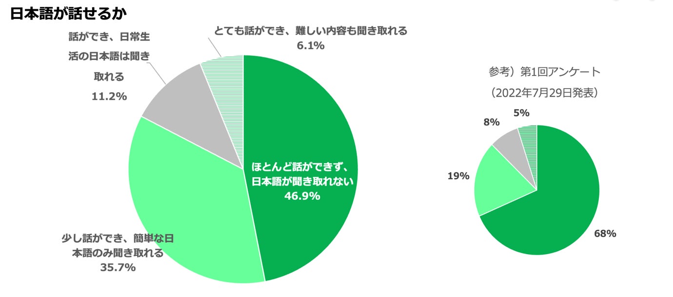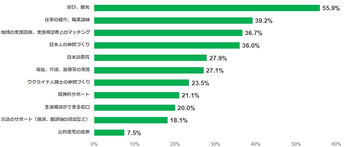 日本語の能力については、51.7%が日本語の支援を受けており、前回調査(7/29発表)で19%だった、「少し話ができ、簡単な日本語のみ聞き取れる」と回答した人が、今回調査では35.7%になりました。必要な支援については、高い順に「遊び・観光」(55.9%)、「仕事の紹介、職業訓練」(39.2%)、「地域の支援団体、支援希望者とのマッチング」(36.7%)、「日本人の仲間づくり」(36.0%)となりました。この結果を受けて、笹川順平ウクライナ避難民支援室担当常務は「避難民の状況が日々変わっていくので、定点的に調査を行い必要な支援をつど見極めていきたい」と述べました。