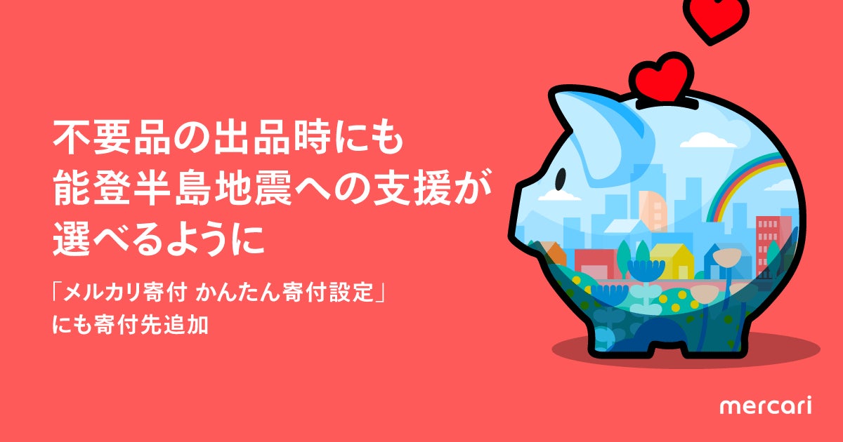 株式会社メルカリ(以下、メルカリ)は、2024年1月15日より「メルカリ寄付 かんたん寄付設定」機能(※2)における寄付先に、能登半島地震による被災地の支援を追加いたします。これにより、「メルカリ」への出品時、寄付先に「日本財団(災害復興支援特別基金)」を選択し、取引完了時に販売利益から事前に指定した割合の金額を寄付することができます。