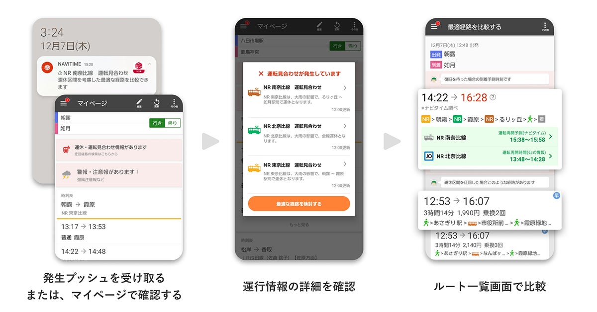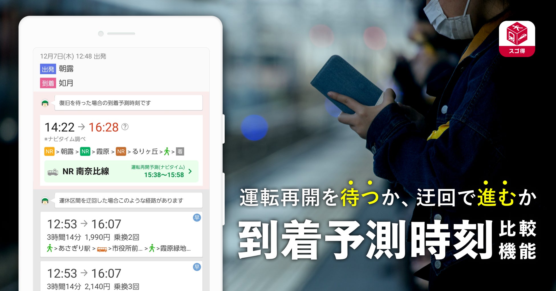 株式会社ナビタイムジャパン(代表取締役社長:大西 啓介、本社:東京都港区)は、2023年12月21日(木)より、株式会社NTTドコモ(代表取締役社長:井伊 基之、本社:東京都千代田区)の提供する「スゴ得コンテンツ®」にて提供中のAndroid OS向け『NAVITIME forスゴ得』※1アプリにて、「マイページ」に登録しているルートの路線に運転見合わせが発生した時に、運転再開を待った場合の到着予測時刻と、迂回ルートで移動する場合の到着予測時刻が一覧で比較できるようになります。