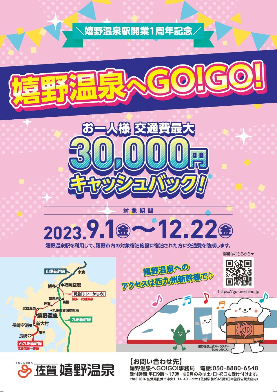 嬉野温泉駅開業1周年記念特別企画 嬉野温泉へGO!GO!キャンペーン 交通費最大30,000円キャッシュバック!