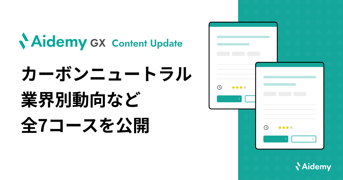 アイデミーは、2014年の設立以降「先端技術を、経済実装する。」をミッションに掲げ、オンラインDXラーニング「Aidemy Business」の提供を通じて、企業のデジタル変革(DX)に伴走してまいりました。DXで目指す業務改善やコスト削減、新規事業の機会創出等とGXの結びつきが強いことから、2021年よりGX関連コンテンツの提供を開始、2023年5月にはGXに特化したオンライン学習サービス「Aidemy GX」として、企業の脱炭素活動を牽引する人材の育成支援に注力しています。