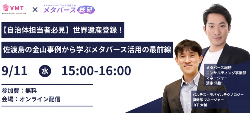 【9/11(水) 無料】 VMT ✕ メタバース総研 共催セミナー 「世界遺産登録! 『佐渡島の金山』事例から学ぶメタバース活用の最前線」