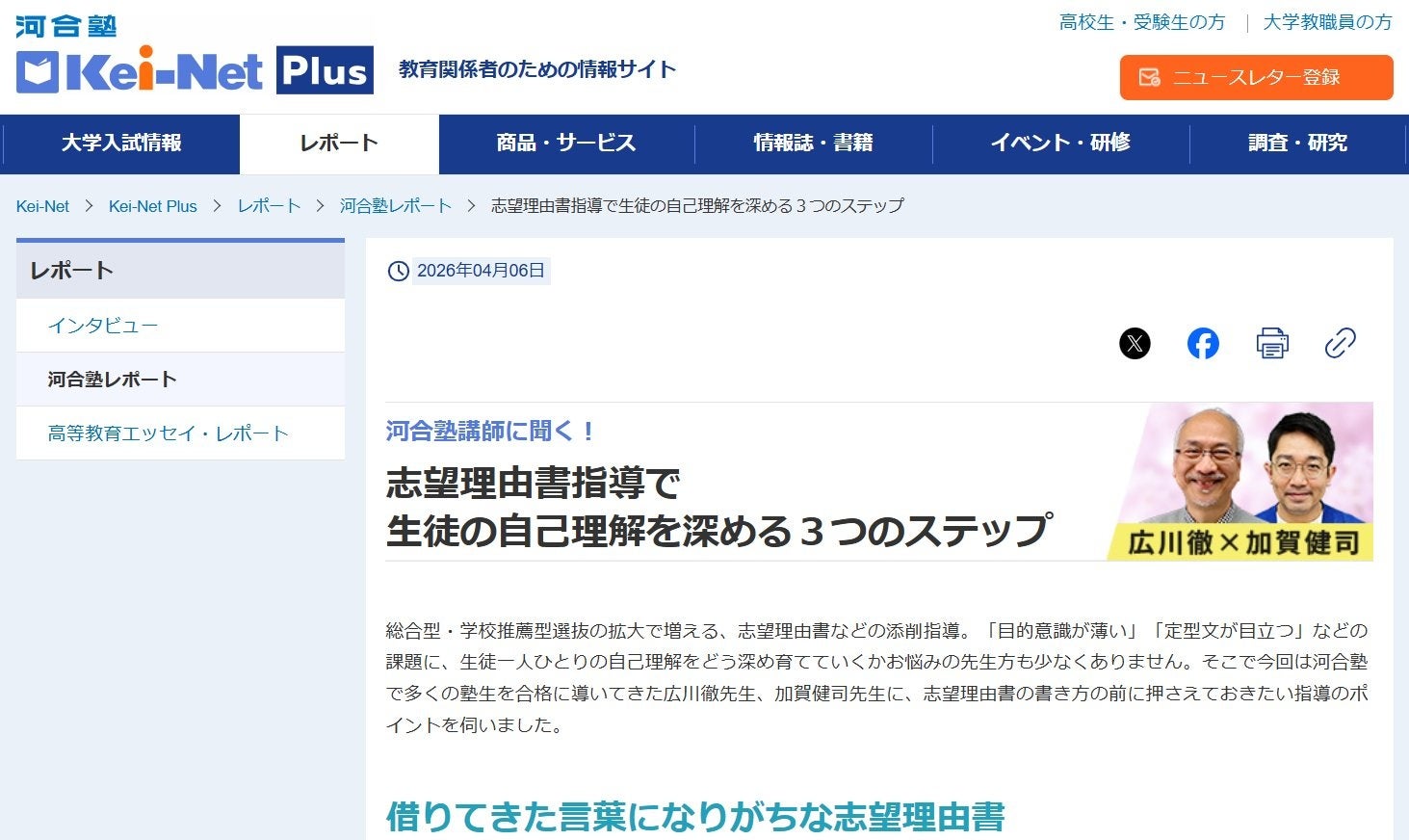 リニューアルを記念して、河合塾小論文科で本書の作成にも携わった広川徹講師、加賀健司講師の特別対談「河合塾講師に聞く!志望理由書指導で生徒の自己理解を深める3つのステップ」を掲載中です。