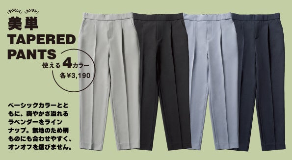夏時期は涼しく快適な着心地を重視したファッションで過ごす方が多くなり、ボトムは夏のコーディネートのポイントになります。P.S.FAでは、ラクに履けて簡単におしゃれなコーディネートを組むことができるパンツスタイルを提案し、新商品としてメンズから、適度なリラックスシルエットとさらっとした肌触りで快適な履き心地、微光沢で高級感のある「テーパードパンツ(ワンタック、ノータック)」、レディスから上品なツヤ感と細見えするテーパードシルエットがきれいめスタイルと高相性な「美単(びたん)テーパードパンツ」を発売いたします。