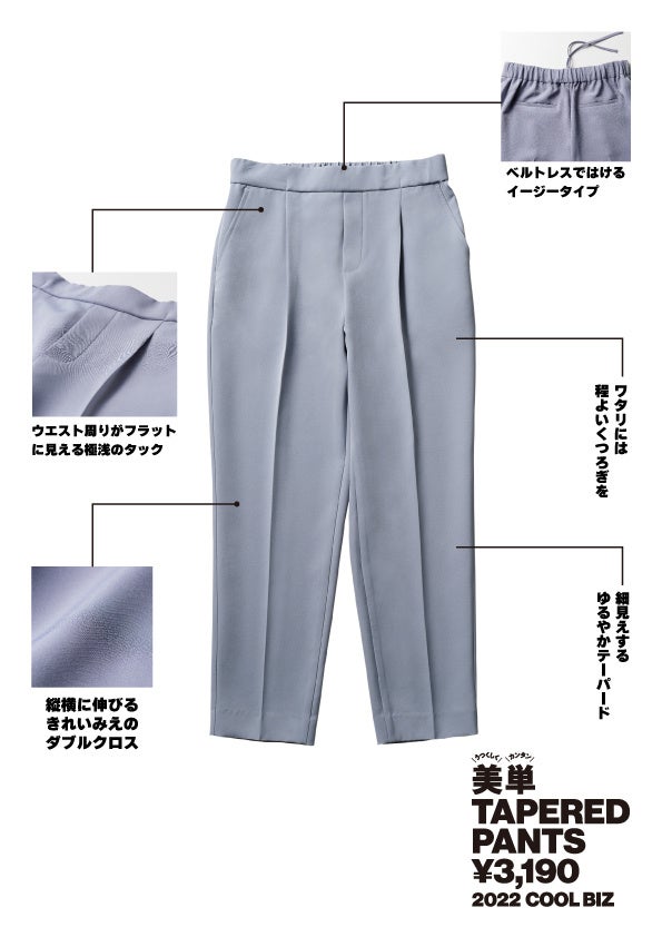 「美単テーパードパンツ」は“うつくしくカンタン”がテーマ。細見えして美しくスタイルアップ、毎日のコーディ―ネートやケアが簡単、ラクに着られるパンツで夏のビジネスファッションを楽しんでほしいという思いから生まれました。さらっとした軽い着心地とストレッチでラクな履き心地、ヒップや太もも周りをカバーしつつもウエストに厚みが出ないよう設計された浅いタックでスタイルアップが叶います。合わせるトップスを選ばない無地デザイン、落ち着いたトーンのカラーでお手持ちのアイテムとの組み合わせも簡単です。ラフなTシャツからきれいめのブラウススタイルまで幅広いコーディネートで活躍します。