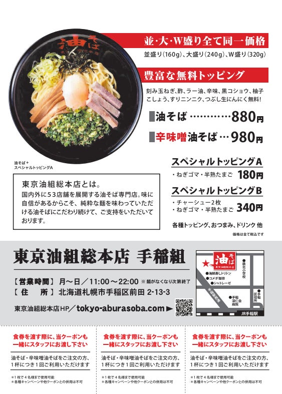 今回、北海道初出店を記念し、2023年4月1日(土)、2日(日)の2日間、「油そば」ワンコイン500円(税込)、「辛味噌そば」600円(税込)でお召し上がり頂けるお得なキャンペーンを実施いたします!※並盛り・大盛り・W盛り同一価格(東京油組総本店 手稲組のみで実施)