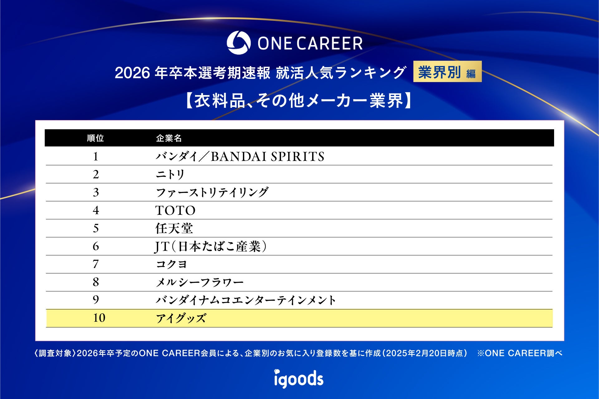 オリジナルグッズを製作するアイグッズ株式会社(本社:東京都渋谷区)は、「ワンキャリア就活人気企業ランキング【業界別編】26卒本選考期速報」において、衣料品、その他メーカー業界部門で第10位を獲得しました。
