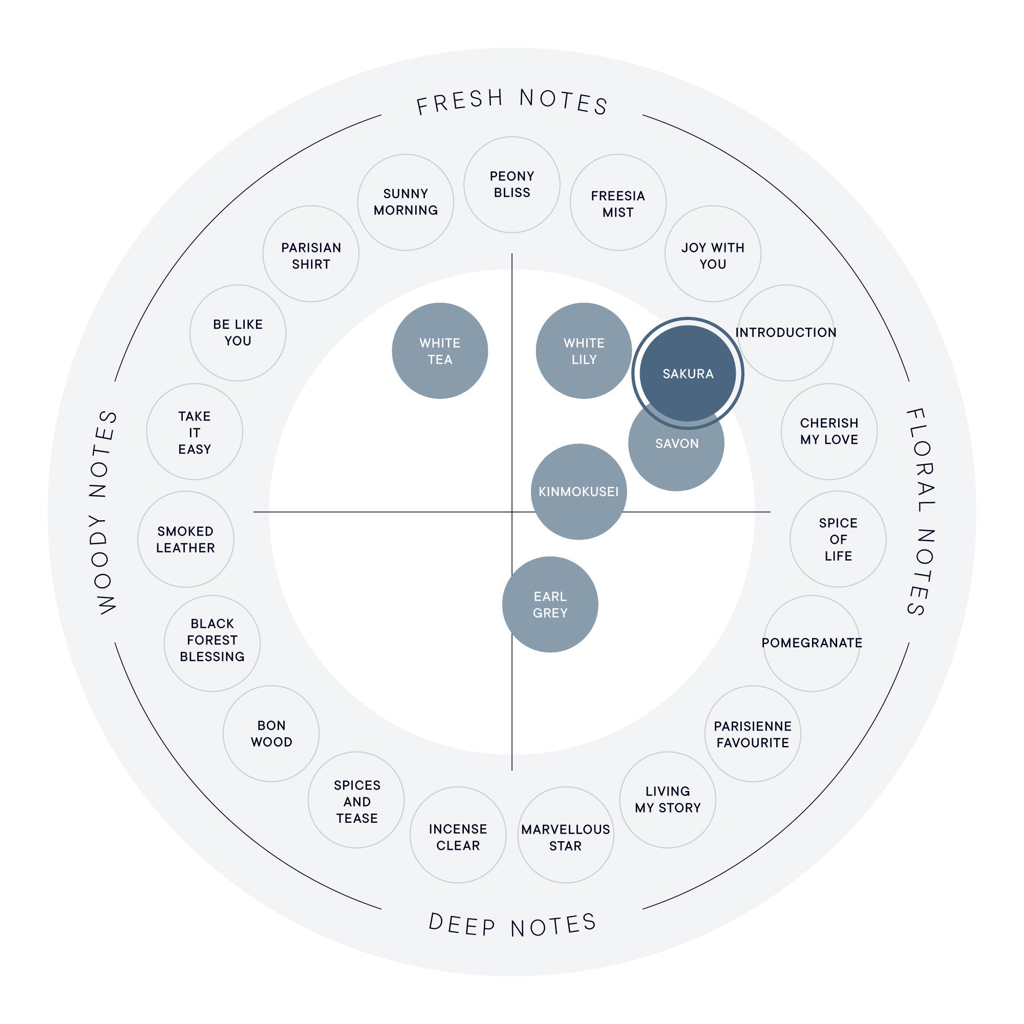 しかし、時の流れとともに人々の香りにおける知識や感度は高まったように思います。そこで今年は、今の時代だからお届けしたい、新しい「さくら」へリニューアルすることにしました。何度も試作を重ねて完成したのは、満開に咲き誇るさくらをぎゅっと詰め込んだような、よりフレッシュで華やかな香りです。