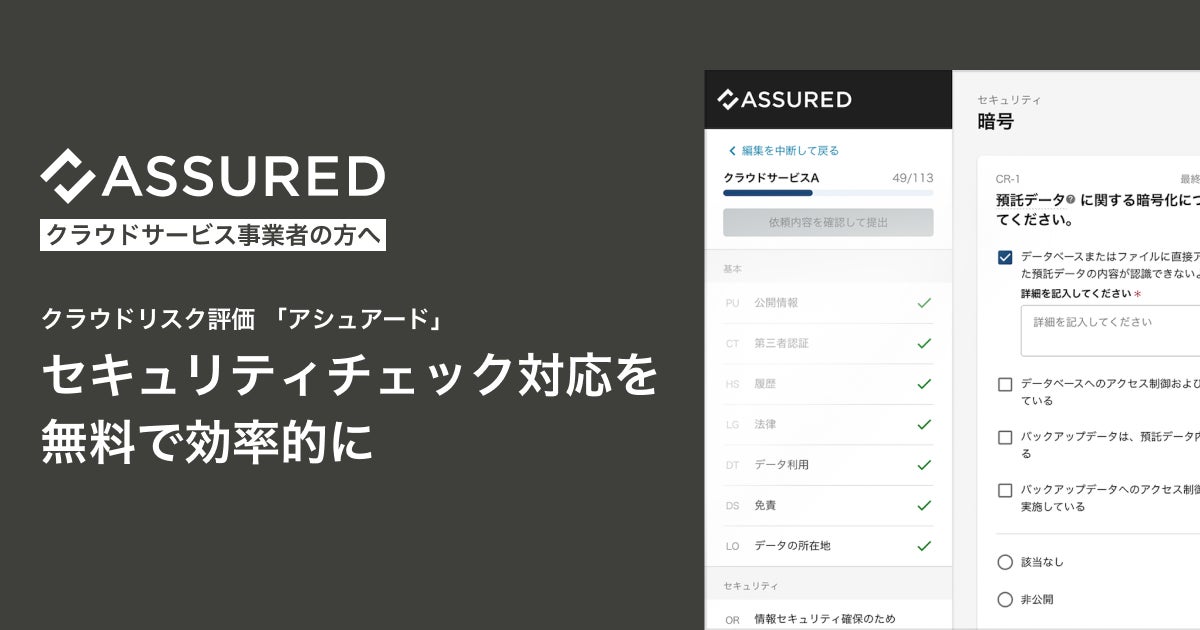 そこで、このたびAssuredは、クラウドサービス事業者向けにセキュリティチェック対応を効率化し、取引先などへの迅速かつ安全なクラウド提供を実現するサービスを正式リリースし、無料で提供を開始します。