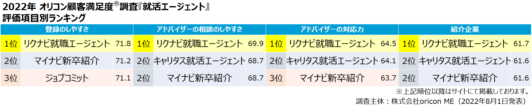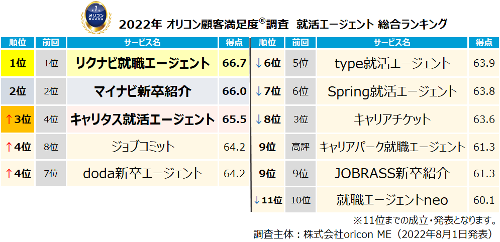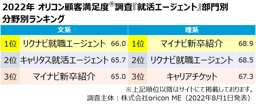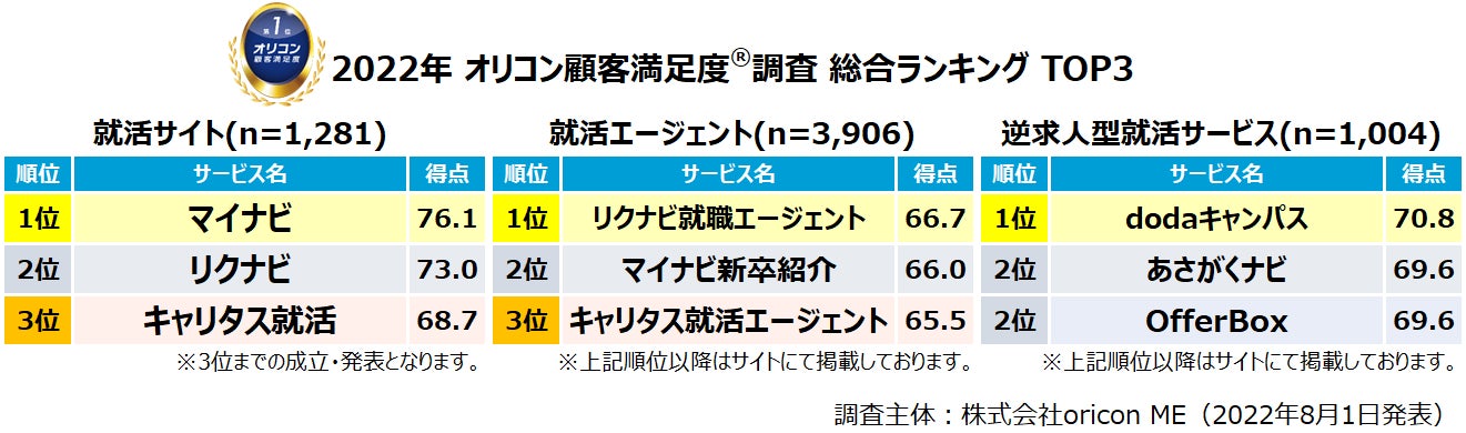 2022年 満足度の高い人材関連ランキング┃就活サイトは【マイナビ】、就活エージェントは【リクナビ就職エージェント】、逆求人型就活サービスは【dodaキャンパス】が総合1位~オリコン顧客満足度®調査
