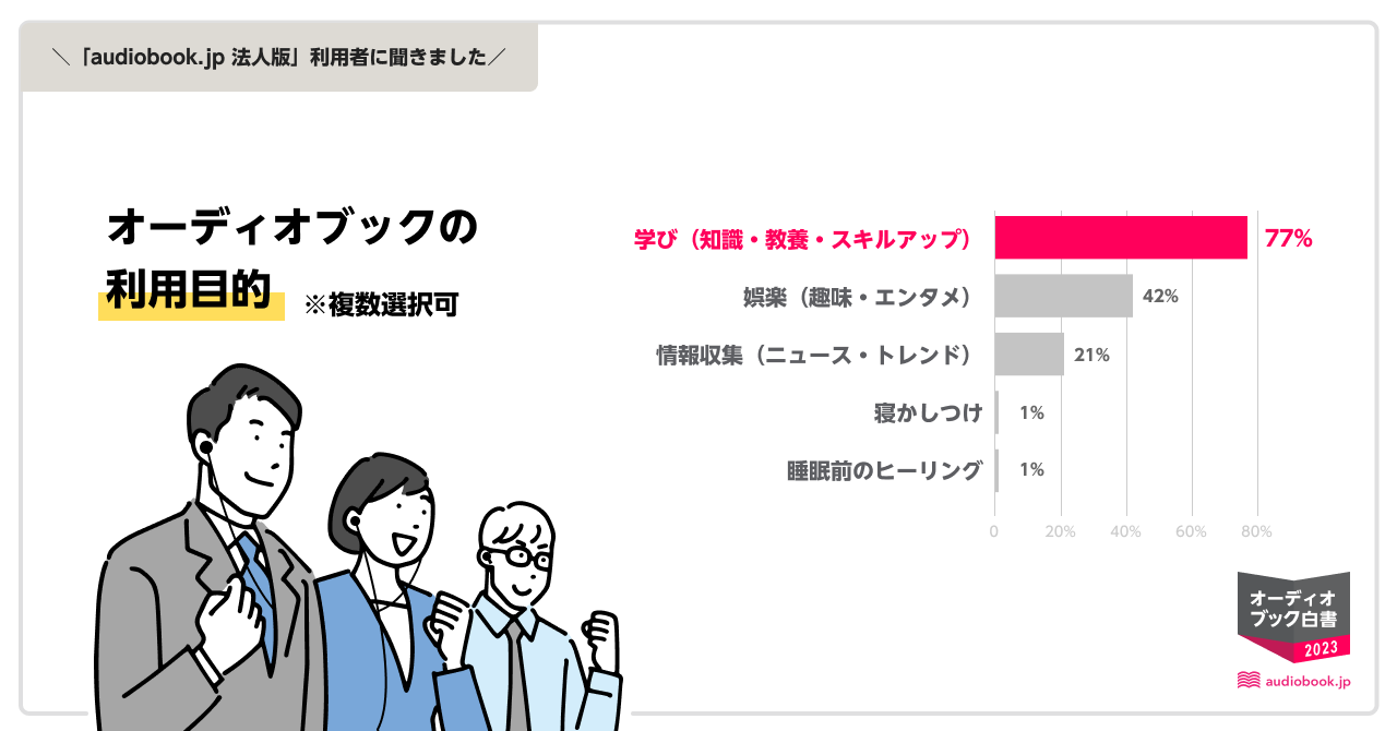 習慣化には学びの合間に娯楽も大事。オーディオブックの利用目的、学び77%、娯楽42%