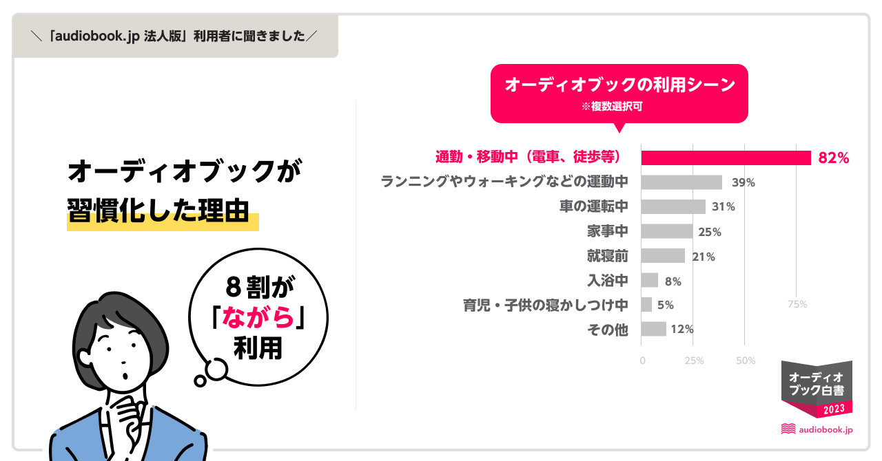 「audiobook.jp 法人版」の高頻度利用者に、オーディオブックの利用が習慣化した理由を聞いたところ、通勤中や家事中、運動中など何かをしながらの「ながら」利用をしていたことだという回答が8割にのぼりました。回答者からは「ウォーキング等の運動中や徒歩での移動中の時間がもったいないと思っていた」というコメントもあり、忙しくなかなかまとまった学習時間を確保することが難しい中、限られた時間を有効に使える=タイパが良いことが、習慣化したくなる背景にあると考えられます。オーディオブックをよく使うシーンについての調査でも、「通勤・移動中」が82%で群を抜いて高いという結果となっており、日々の通勤・移動時間を学びの時間としてタイパ良く活用しているようです。