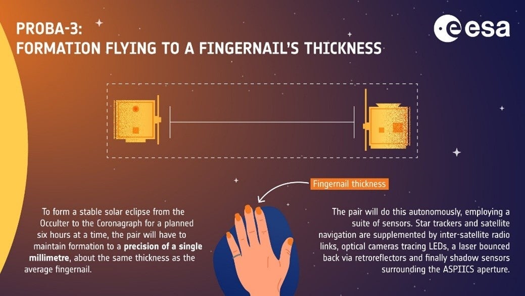 Proba-3ミッションでは、コロナグラフ衛星とオカルター衛星の2基の衛星が150メートルの間隔で完璧な編隊を組んで、一回あたり6時間飛行することを目指しています。この配置は時速22,000マイルで飛行しながらミリ単位の精度で維持され、ほぼ完璧な日食を作り出すので、科学者たちはこれまでよりも太陽の周縁部に近い部分で太陽のコロナを研究できます。この偉業の鍵は、オンセミのSiPMで可能になった正確なアライメント技術にあります。これらのセンサがなければ、同じセットアップを実現するのに、2基の衛星を150メートルの長さで物理的に接続する必要がありますが、これは宇宙飛行とペイロードの制約からして実現不可能です。