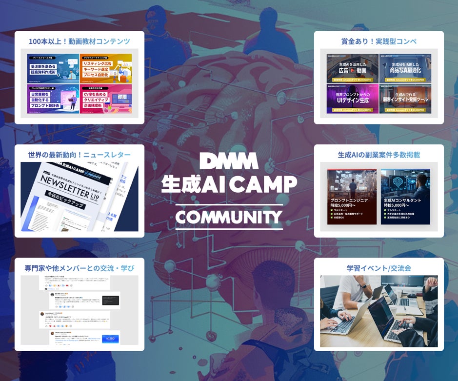 本コミュニティは、ただの情報共有や学習イベントにとどまりません。DMM WEBCAMP、DMM 生成AI CAMPなど“教育×コミュニティ”に実績のあるDMMグループならではのノウハウが凝縮しています。生成AIの最新トレンド、活用ノウハウ、そして実際の副業案件までを一元的に提供します。