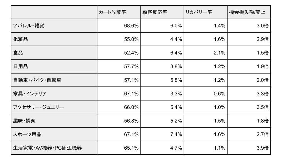 「アパレル・雑貨」「家具・インテリア」「アクセサリー・ジュエリー」「生活家電・AV機器・PC周辺機器」は、機会損失が売上の約3倍〜3.9倍に上り、他のカテゴリよりも高い傾向でした。高単価な商品ほど機会損失額は大きくなる可能性があり、ユーザーも比較検討をしていると考えられるため、まだカゴ落ち対策をしていないサイトは早めの対策をお勧めします。