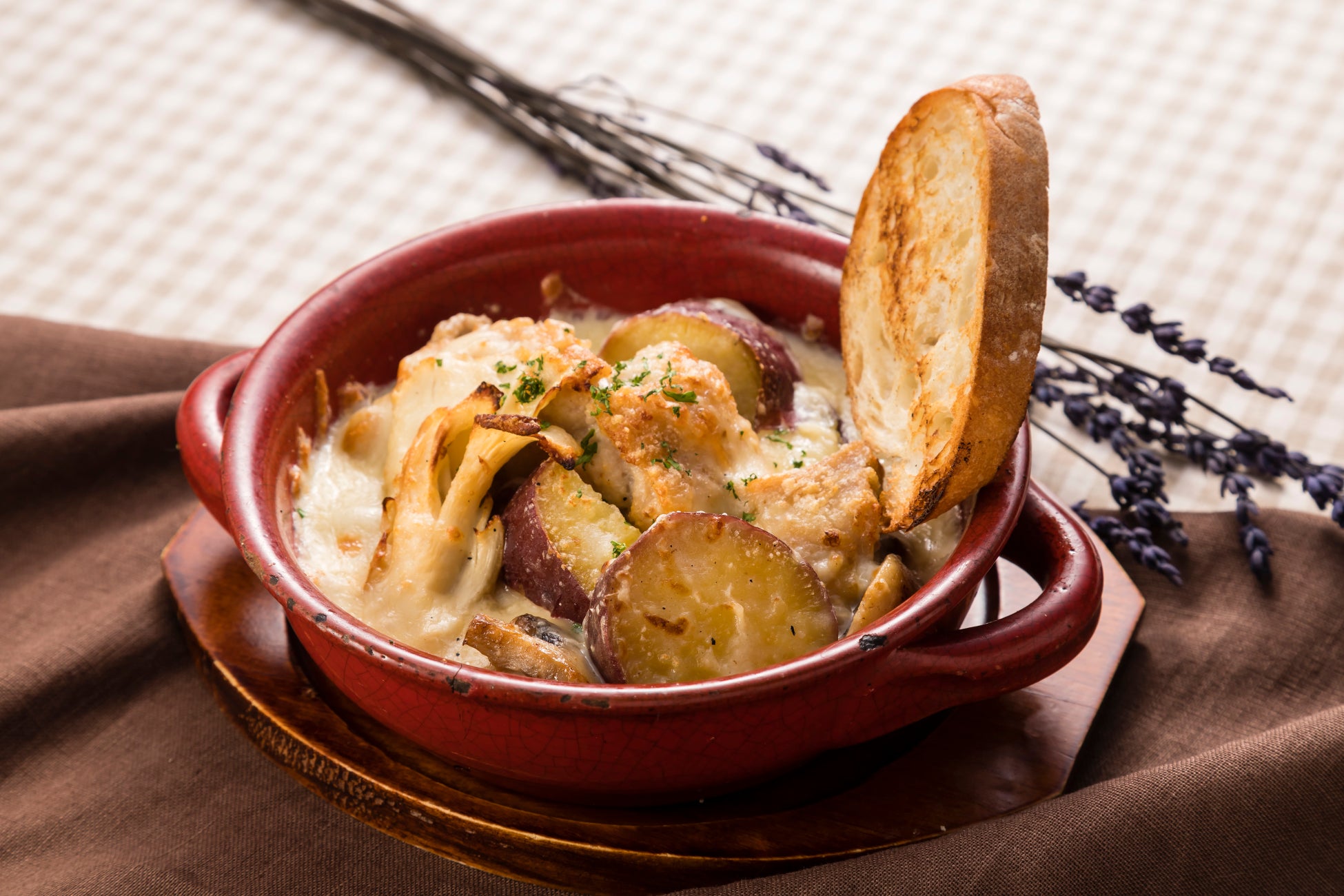 内容:鶏肉とさつまいもを使用し、ニンニクとスパイスをきかせたホワイトソースで仕上げたジョージア料理「シュクメルリ」風のグラタン。