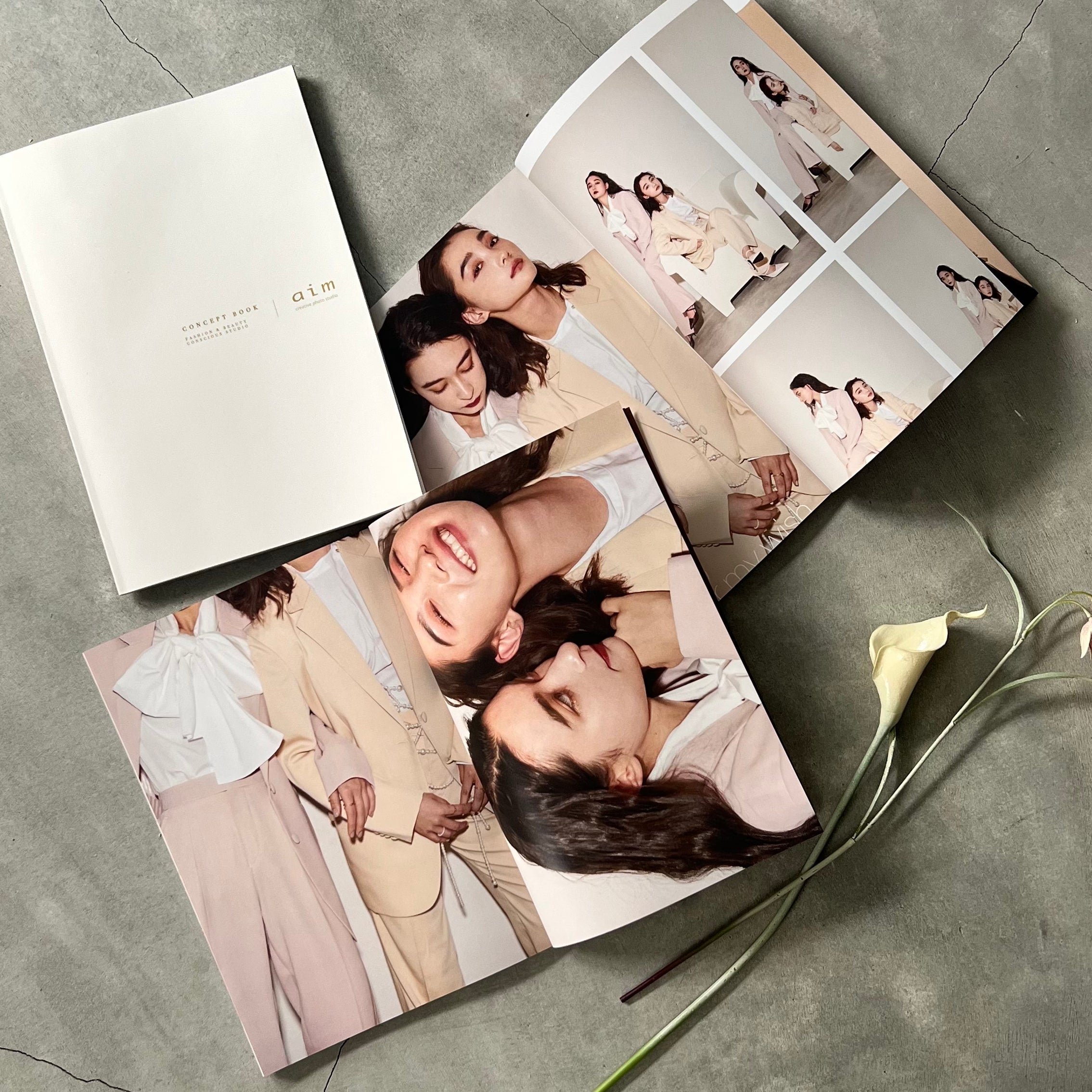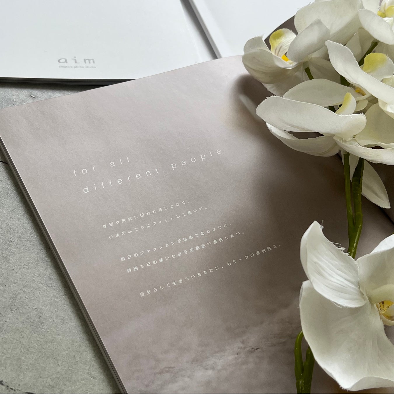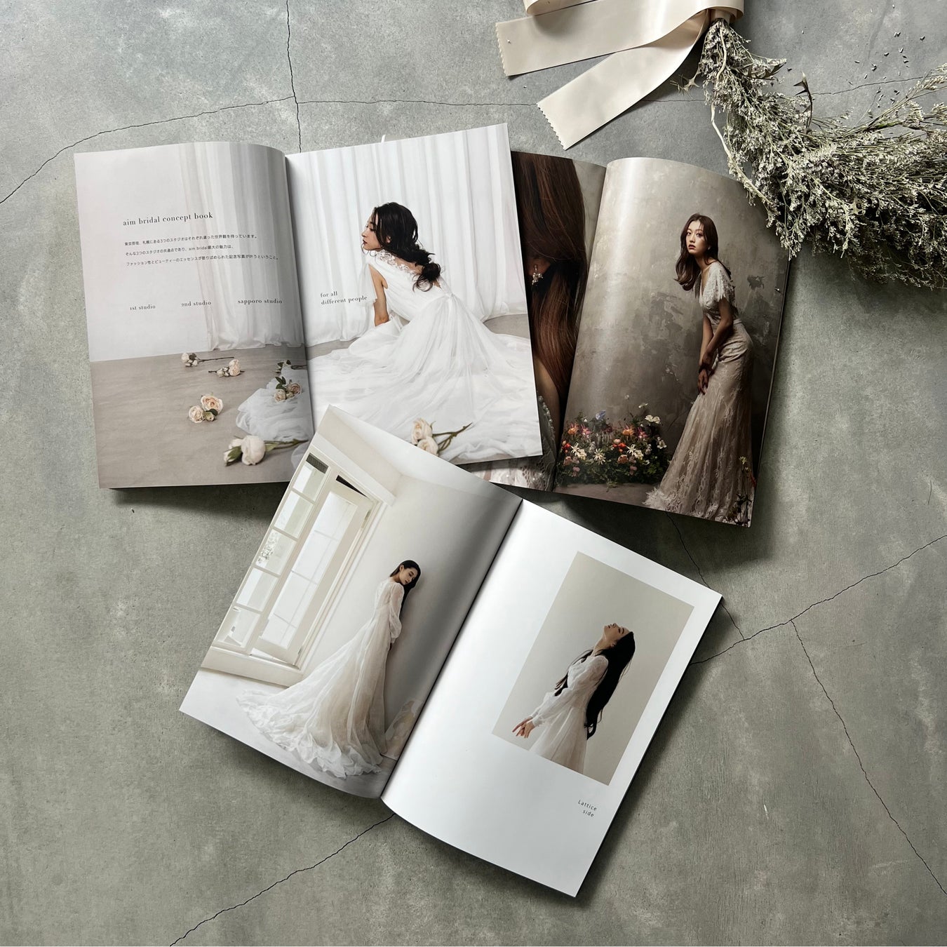 ビジュアルがメインのコンセプトブックは、aimブライダルの最新ビジュアルを紹介しています。