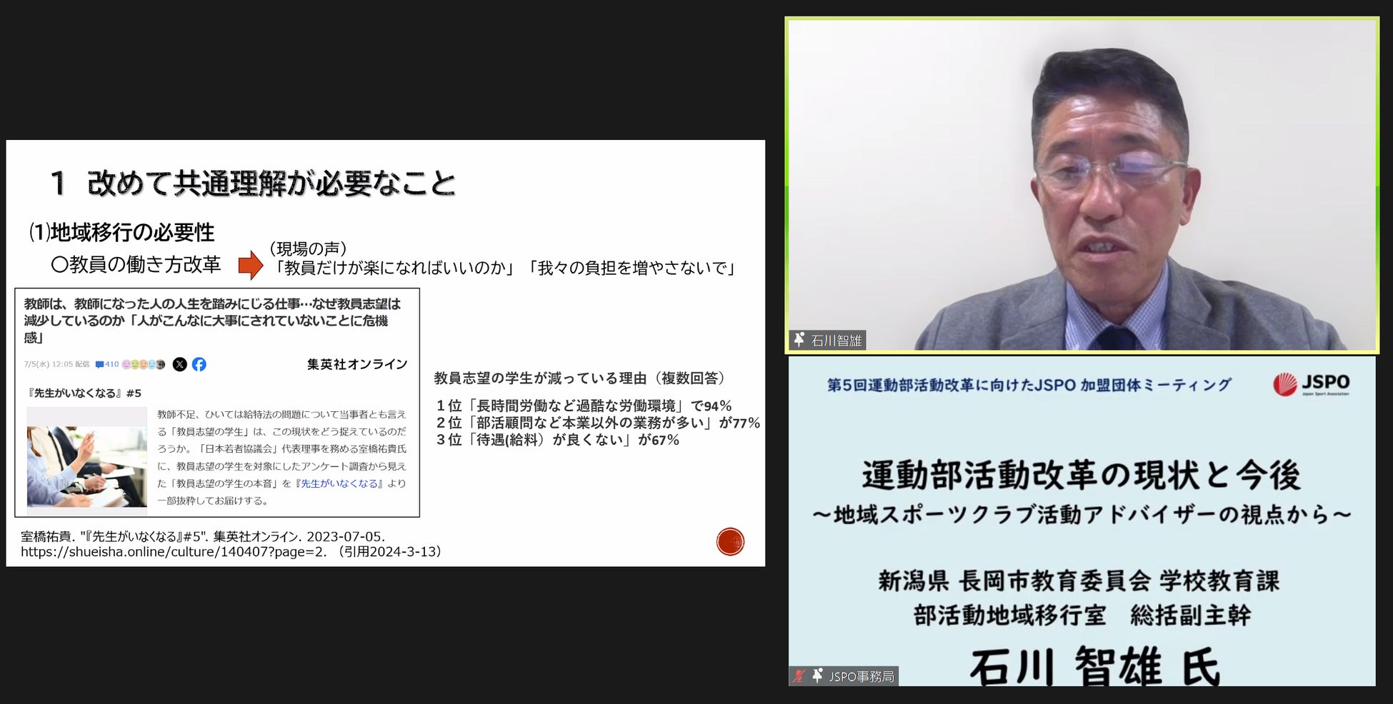 続いて、今回は長岡市教育委員会の石川智雄氏から、地域において部活動とスポーツクラブの橋渡しを支援する立場から情報提供をいただくとともに、出席者との質疑応答も行いました。