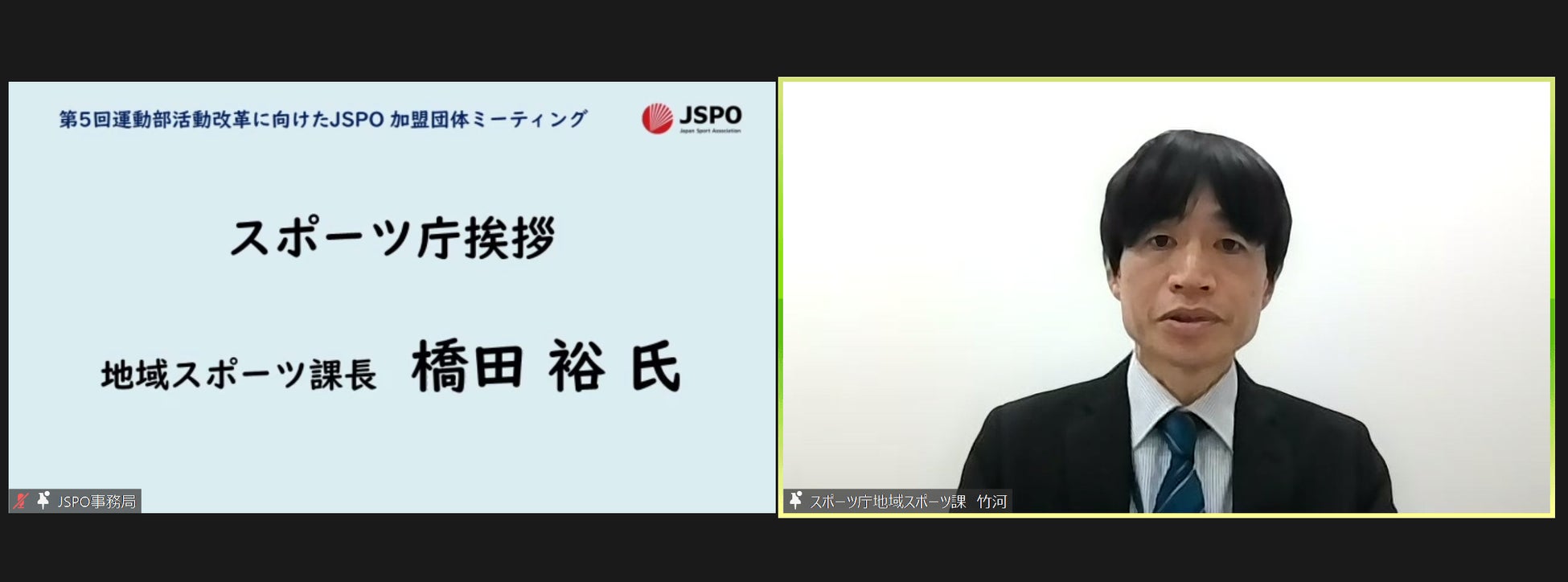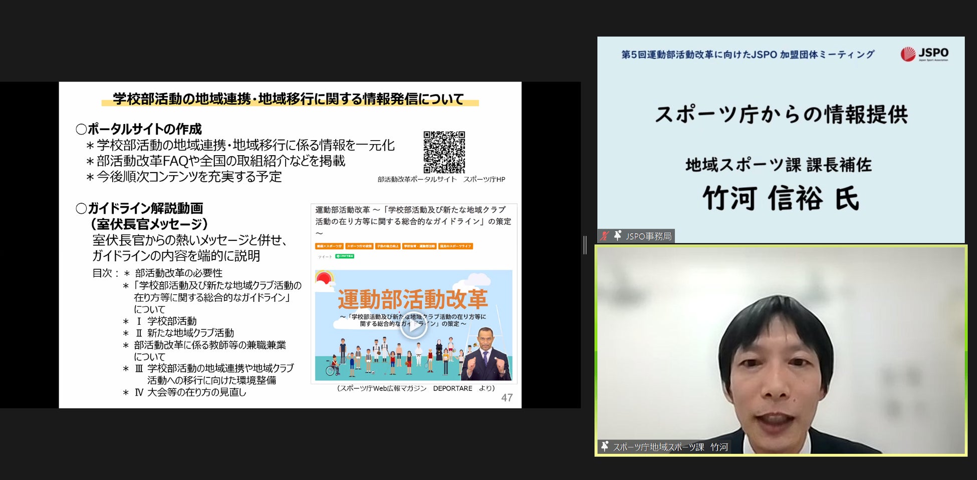 13:10 | 1.情報提供 1)JSPO:ロードマップの進捗状況等 2)スポーツ庁: 部活動の地域連携・地域クラブ活動への移行と 地域スポーツ環境の整備に関する最近の動向 | JSPO事務局 スポーツ庁地域スポーツ課 課長補佐 竹河 信裕 氏 |
