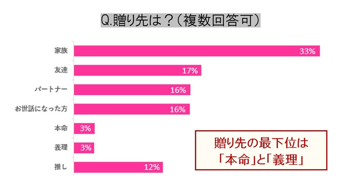→自分用チョコは「金額は気にしない」が最多回答であるのに対し、贈るチョコは「3,000円まで」が半数を上回る結果に。「高級チョコは贈るのではなく自分用」という傾向があるようです。