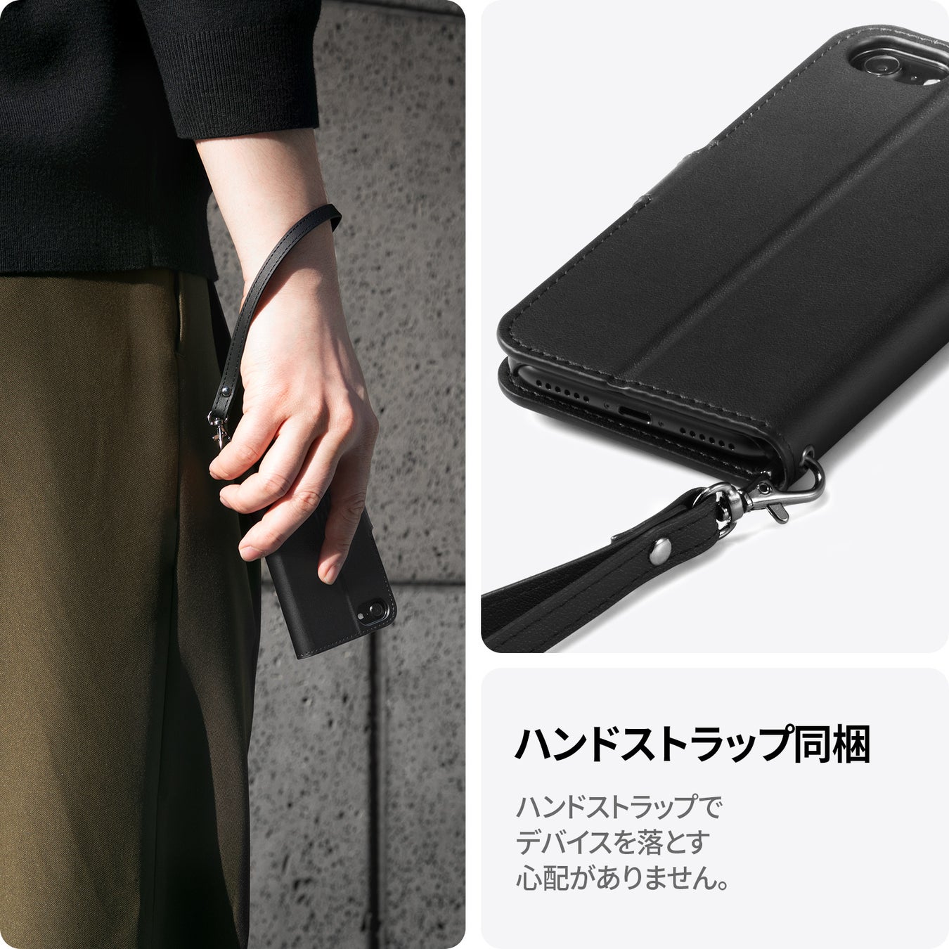 お客様自身を表現するのはもちろん、同梱されているspigenのハンドストラップで