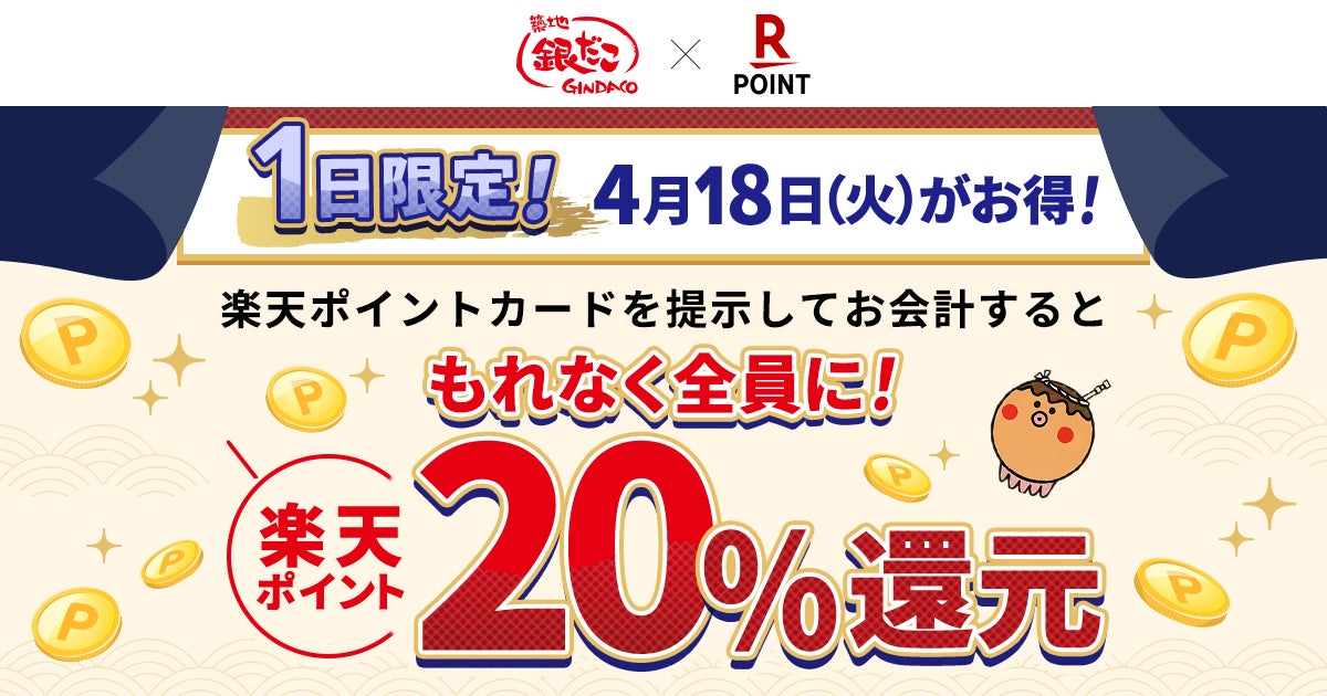 「楽天ポイントカード」、「築地銀だこ」「銀だこハイボール酒場」などで4月18日限定で「楽天ポイントカード提示でもれなく全員に20%還元キャンペーン」を開催