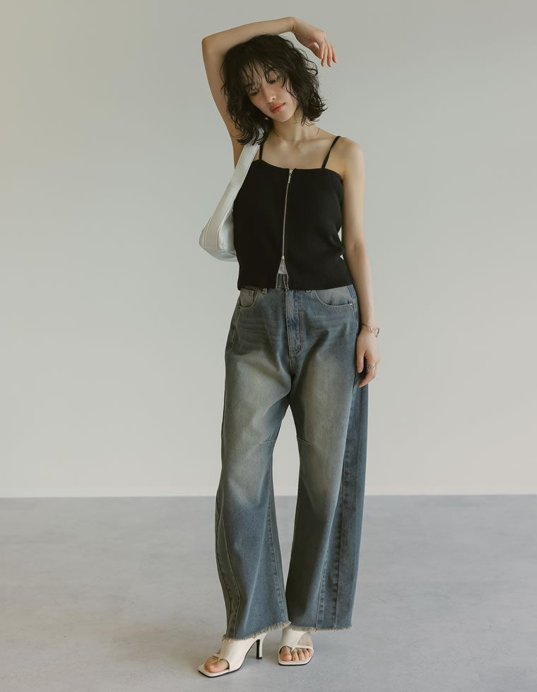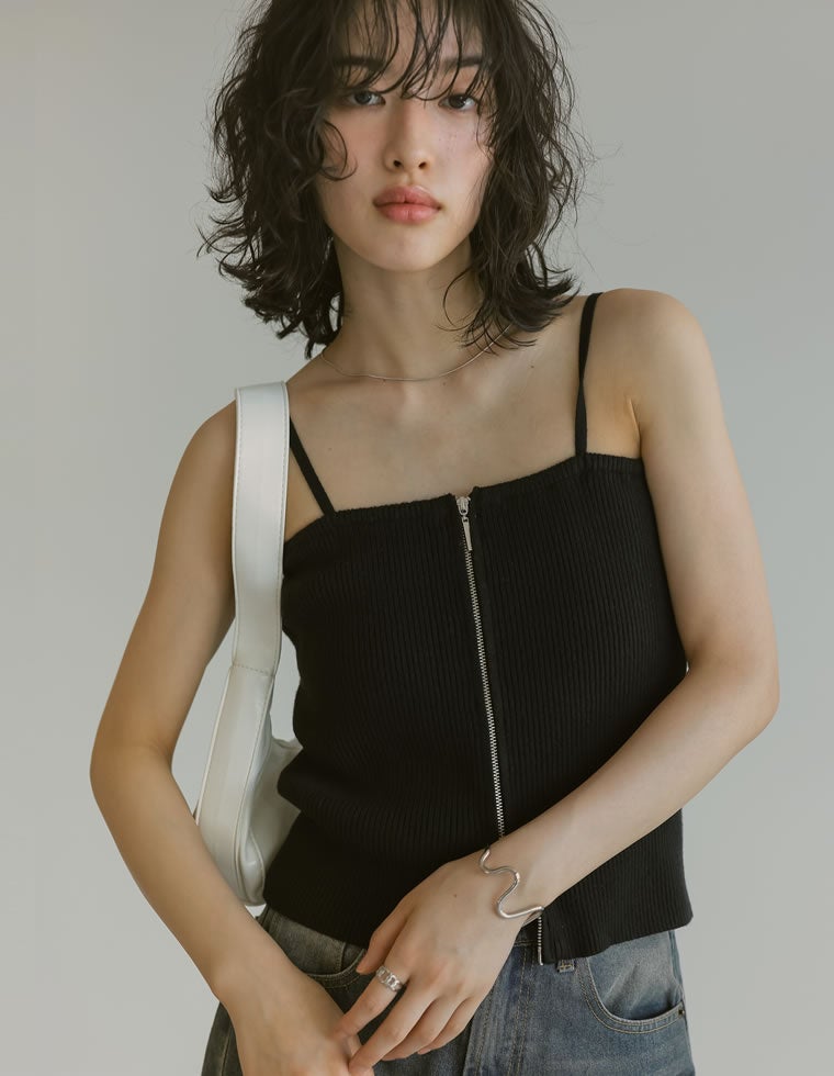 ジップ開閉のアレンジはもちろん、肩紐を中に入れ込めばベアトップとして着用も可能。