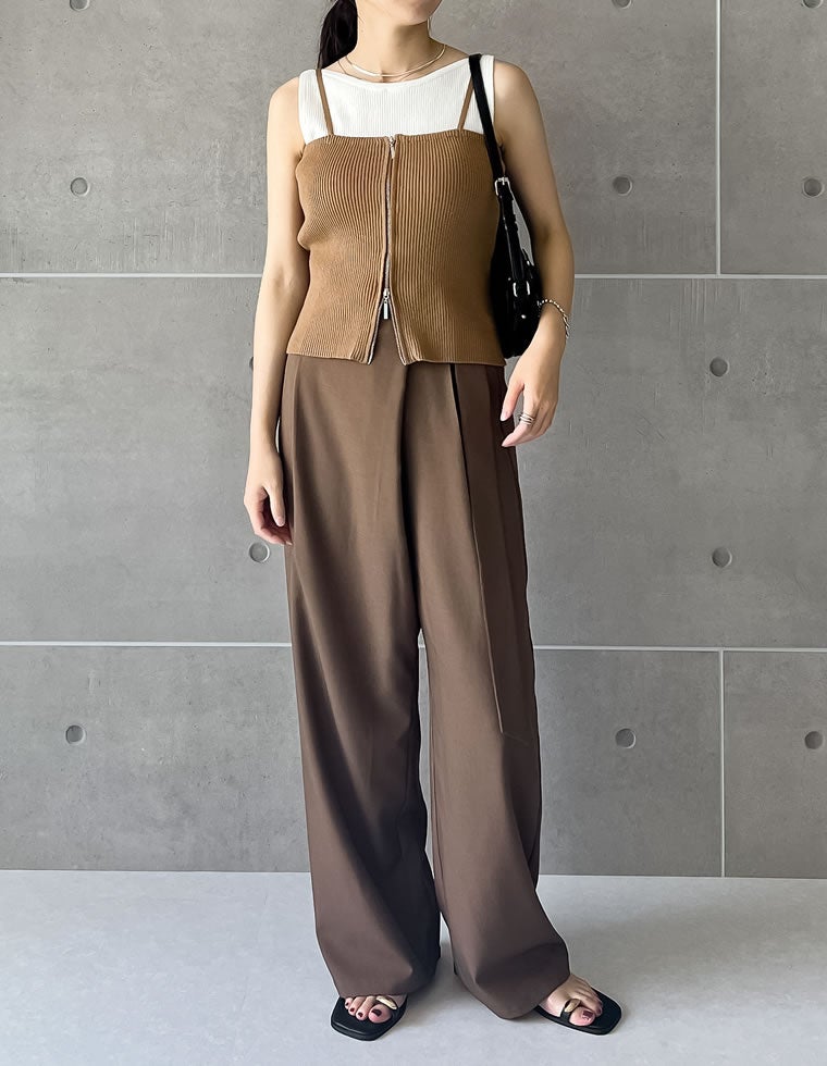 トレンドのダブルジップで、上を開けるとデコルテをすっきり見せ、下を開けるとスリットのような抜け感のある着こなしに。