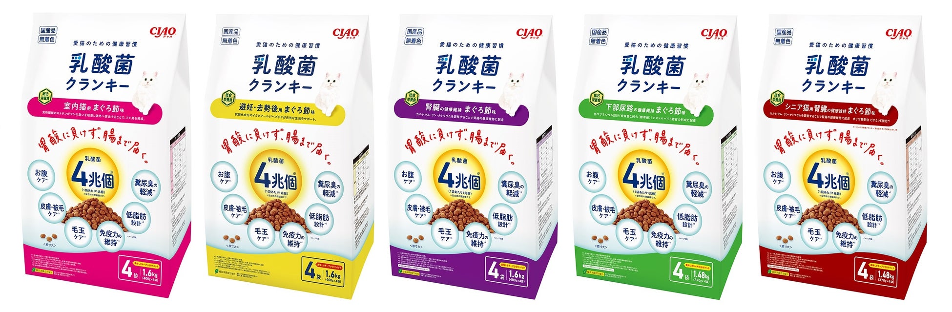 「室内猫用 まぐろ節味」「避妊・去勢後用 まぐろ節味」「腎臓の健康維持 まぐろ節味」「下部尿路の健康維持 まぐろ節味」「シニア猫用 腎臓の健康維持 まぐろ節味」の5種類。