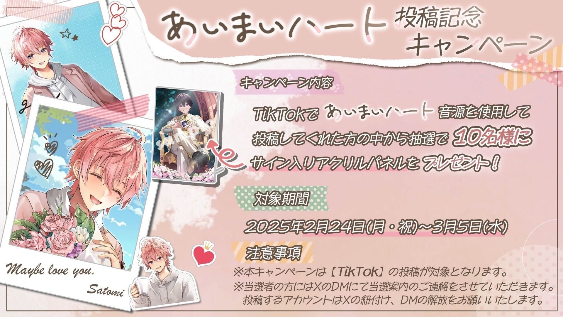 TikTokで『あいまいハート』音源を使用して投稿したの中から、抽選で10名様に【直筆サイン入りアクリルパネル】をプレゼントいたします!この投稿数に合わせてさとみ公式LINEで特別な写真のプレゼントやすとぷりメンバーとのコラボ動画の投稿を行っていきます。なんと、投稿数が30,000に到達いたしますと、抽選で3名に「さとみ」の私物をプレゼント!