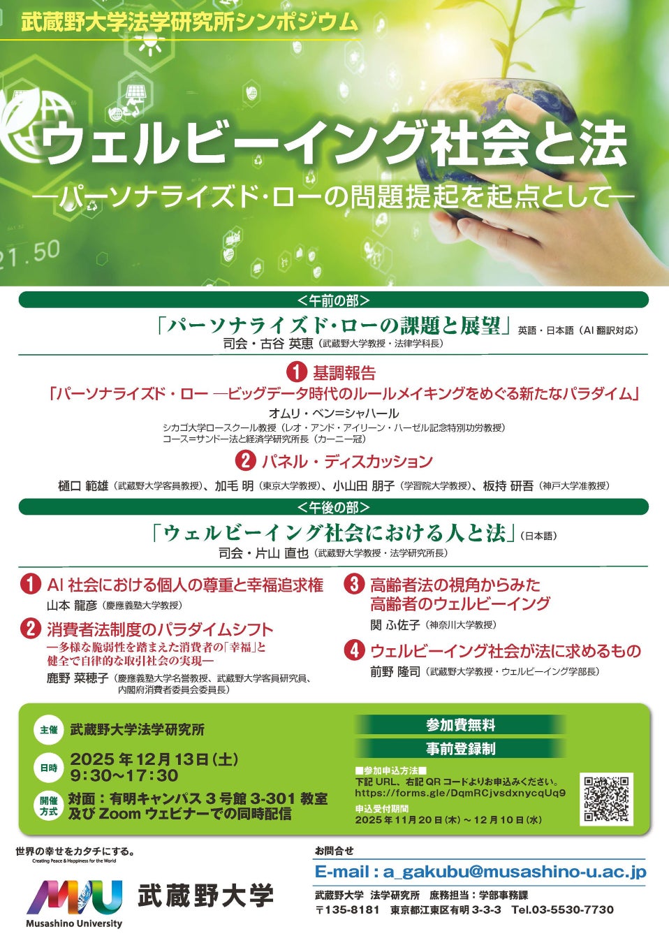 武蔵野大学法学研究所(所長:片山 直也)は、12月13日(土)に武蔵野大学有明キャンパス3号館でシンポジウム『ウェルビーイング社会と法―パーソナライズド・ローの問題提起を起点として―』を開催します。