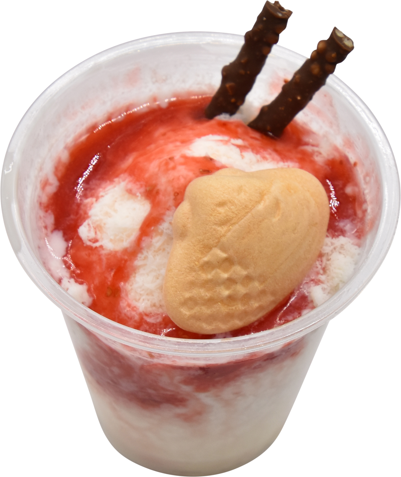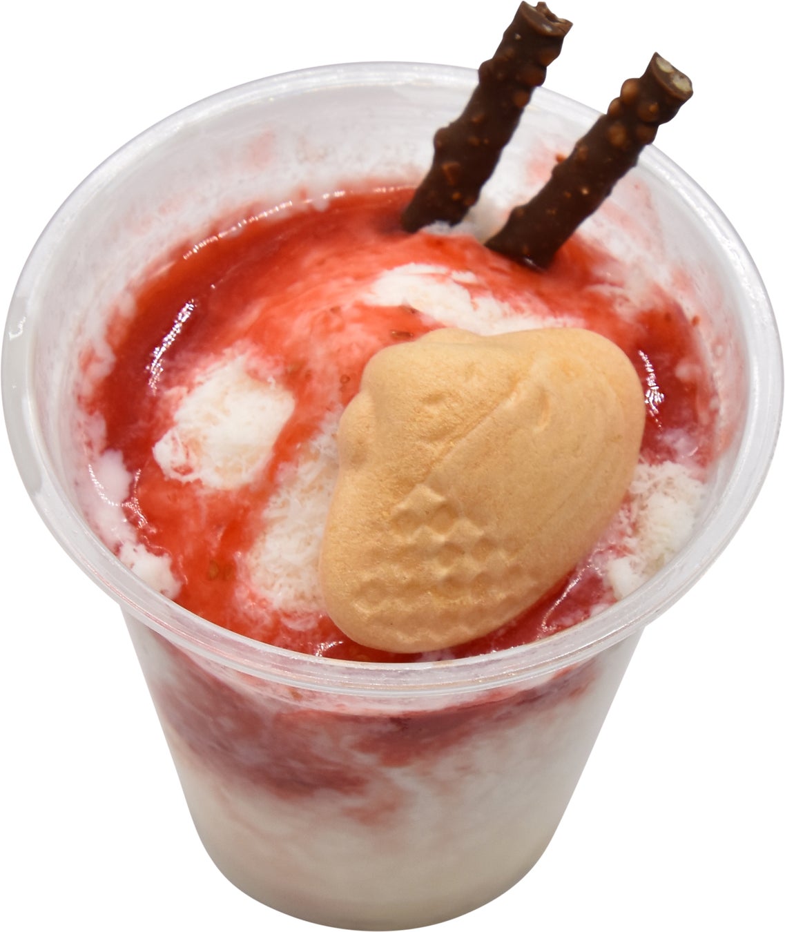 イマジョをイメージした赤生イチゴシロップをトッピングしたミルク味のかき氷