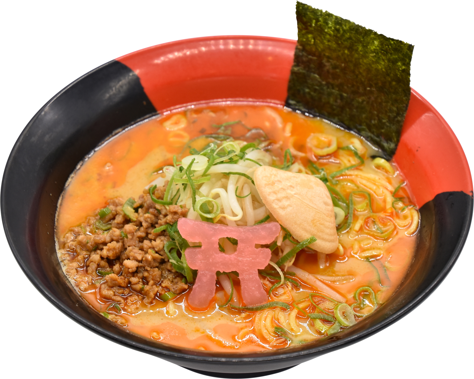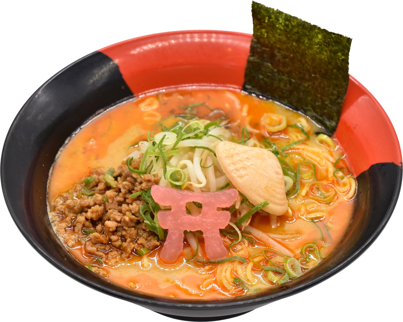 劇中に登場するイマジョをイメージした赤いスープに、本作品の象徴となる鳥居などをあしらった具材をトッピング。「日清やみつきオイル」5アイテムから、お好きなオイルをかけて、お召し上がりいただけます。