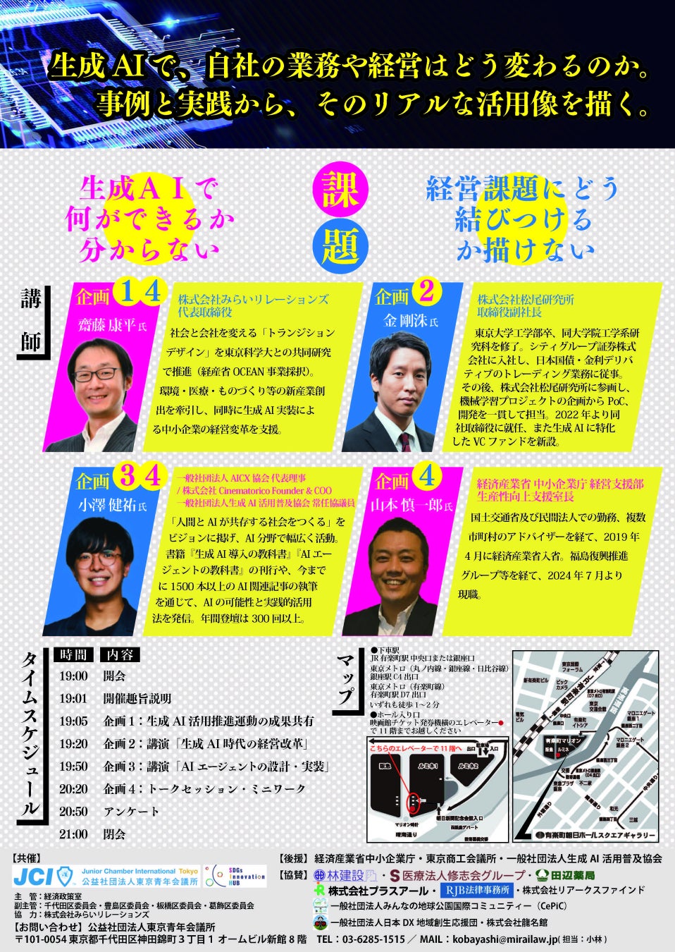 本イベントは、中小企業が生成AIを単なるツールとして理解するにとどまらず、自社の経営・業務課題に結び付けた具体的な活用像を描き、実際の行動へと踏み出すことを目的としています。