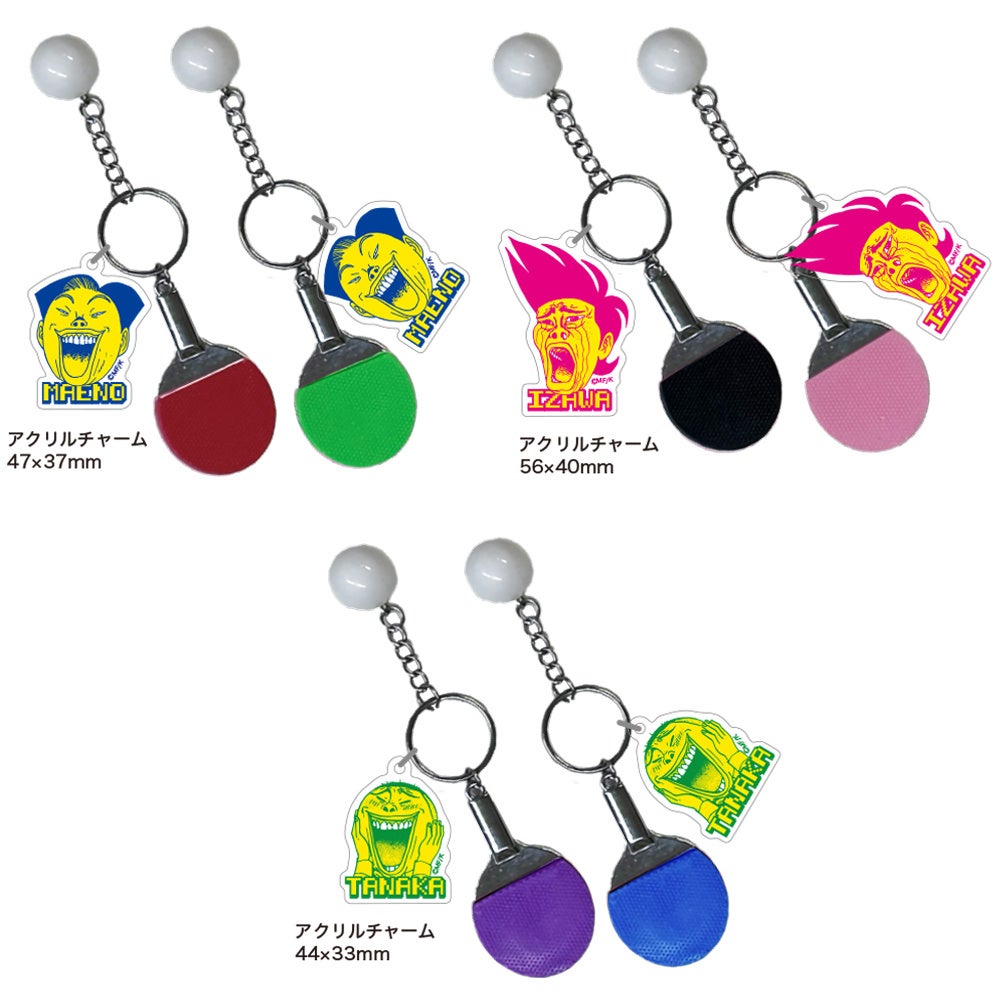 『行け!稲中卓球部』が卓球部だということを忘れてはいませんか?卓球らしさが1mmもない稲中キャラたちが、ラケット型のキーホルダーとセットで登場!3種全6色のミニラケット&ピンポン玉がついたキーホルダーに、前野、井沢、田中の3名のチャーム付き!