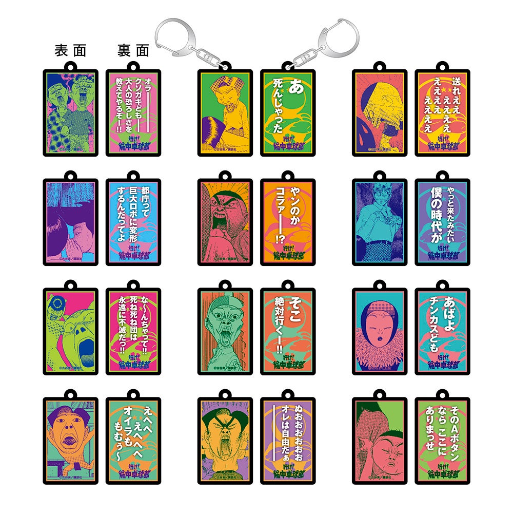 『行け!稲中卓球部』の珠玉の名言集を12種類のアクリルキーホルダーとして一挙リリース!各キャラクターたちの名場面、傑作ギャグ、印象深いシーンをコマとセリフの両面仕様で厳選!稲中らしいポップな色使いもかわいらしい!キミは全部覚えているかな?