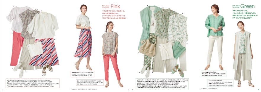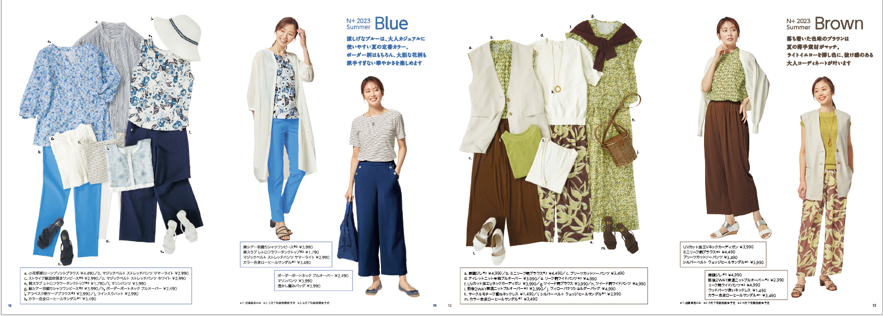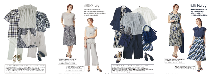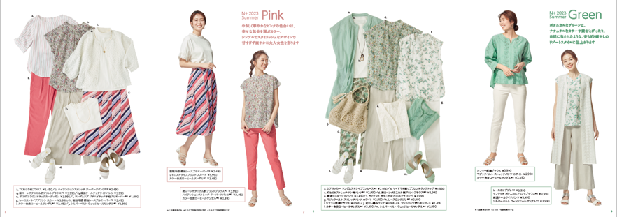2023年夏の新作カタログでも、色のつながりを意識したカラーコーディネートを表現しています。グレー、ネイビー、ピンク、グリーン、ブルー、ブラウンの6⾊を軸に、色ごとに掲載したページ内で様々なコーディネートをお楽しみください。N+のコンセプトを実感していただける1冊です。