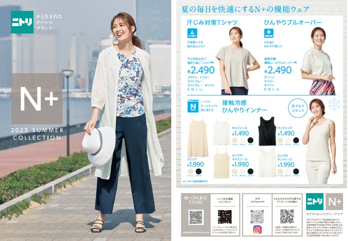 ニトリグループのアパレルブランド「N+」を展開する株式会社Nプラス(本社:東京都北区 代表取締役社⻑:⾼橋陵)は、2023年夏の新作「N+ 2023 SUMMER COLLECTION」を販売開始いたしました。あわせて、夏の新作カタログを発刊。N+全店舗では5月3日(水)から、全国のニトリ店舗やデコホーム店舗では5月12日(金)から、順次新カタログの配布を開始しています。是⾮ご覧ください。※店頭配布のカタログは無くなり次第終了。