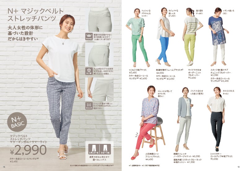 1枚でさらっと着られて楽な着心地のワンピースや、接触冷感素材を使用したパンツ、⼤⼈⼥性の体形を3D分析して開発し、様々なシーンで活躍するマジックベルトストレッチパンツの新作など、大人の女性に嬉しい夏のアイテムを多数展開しています。