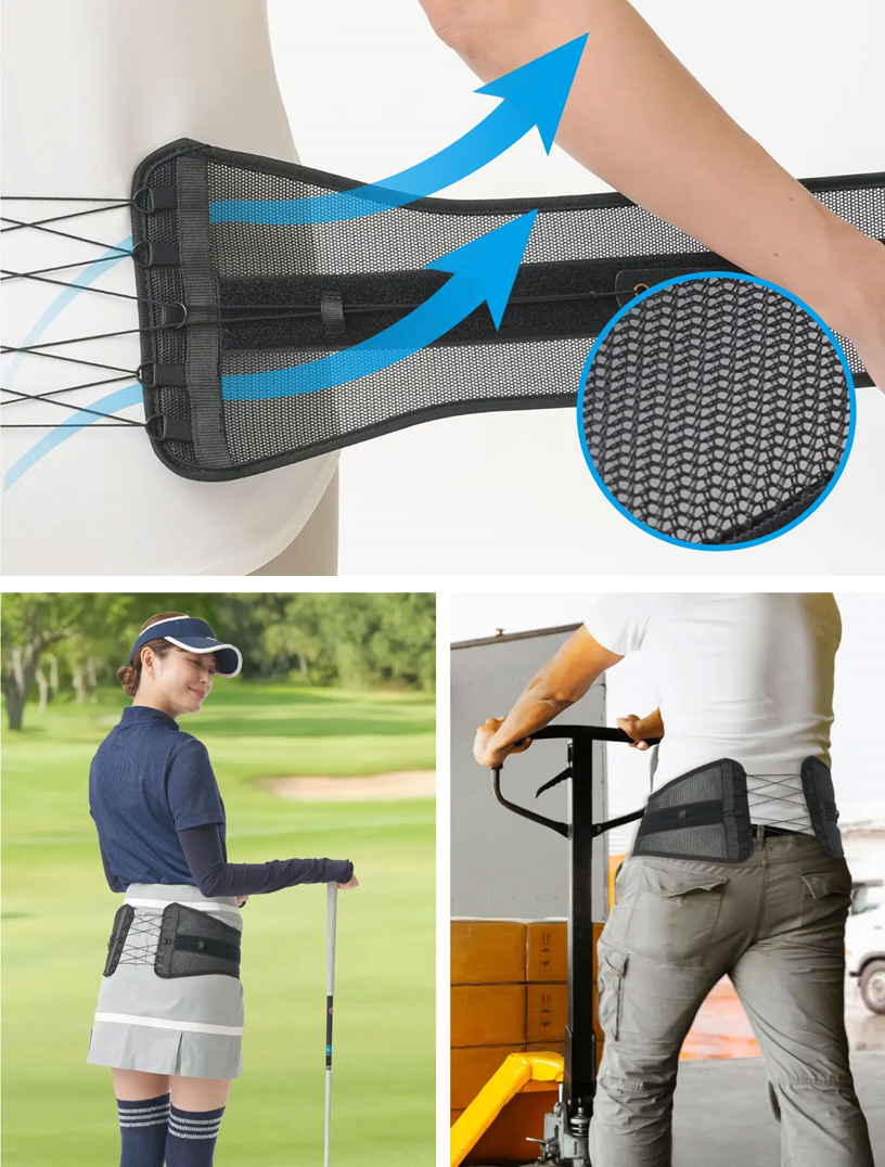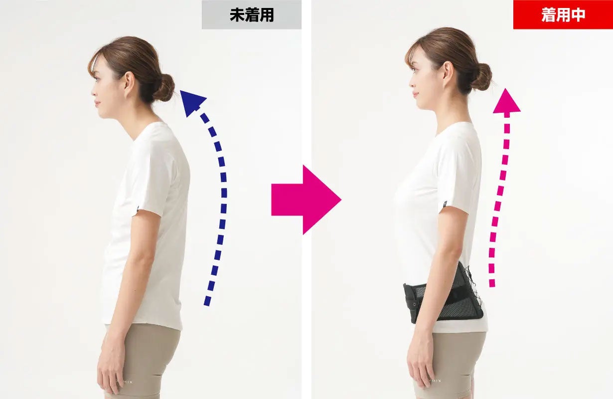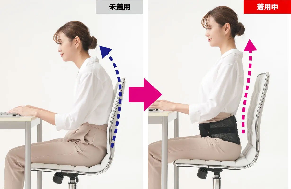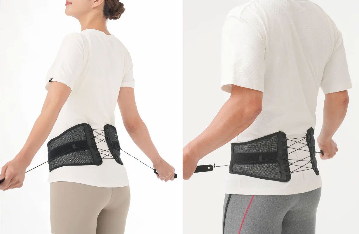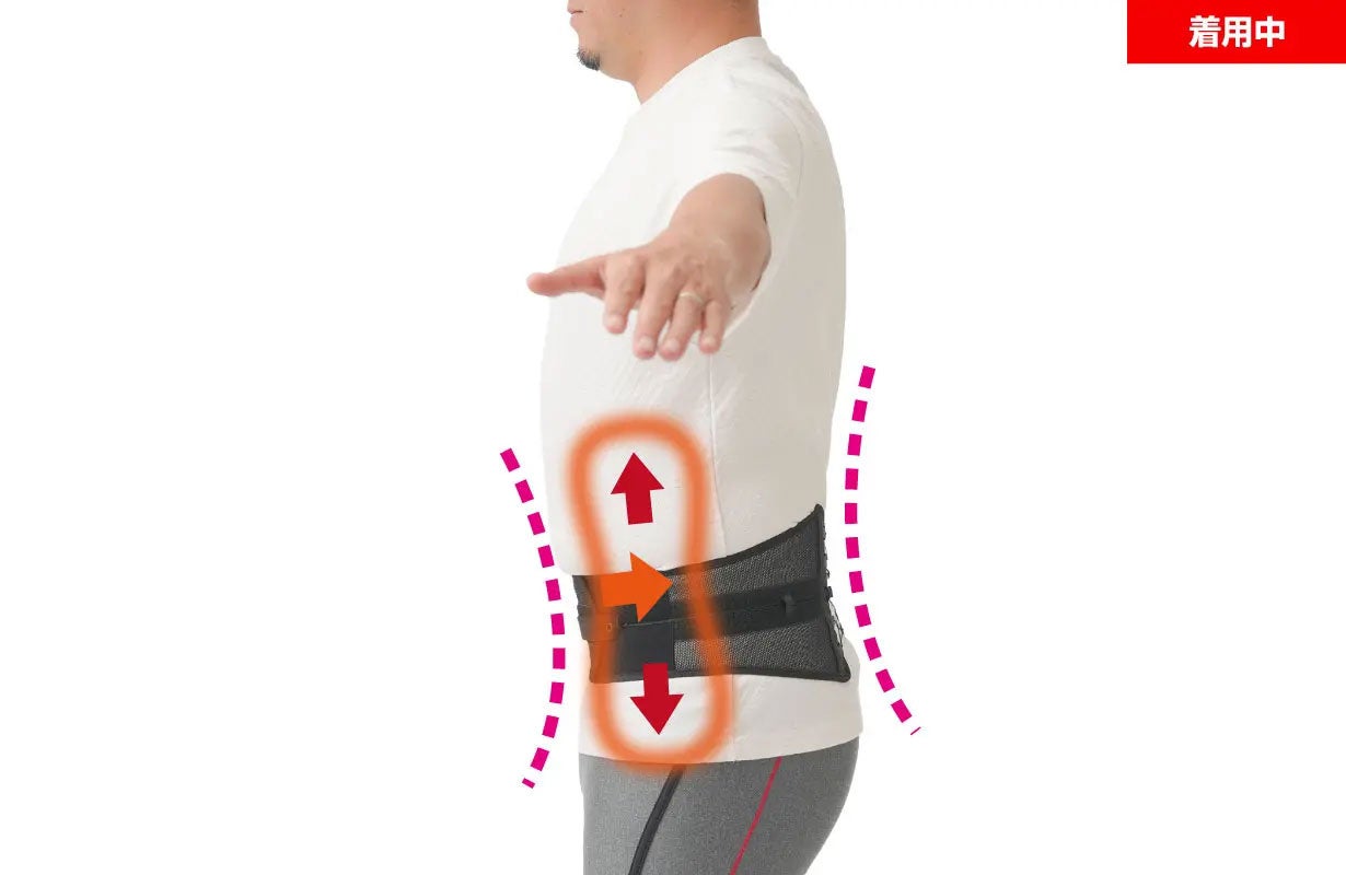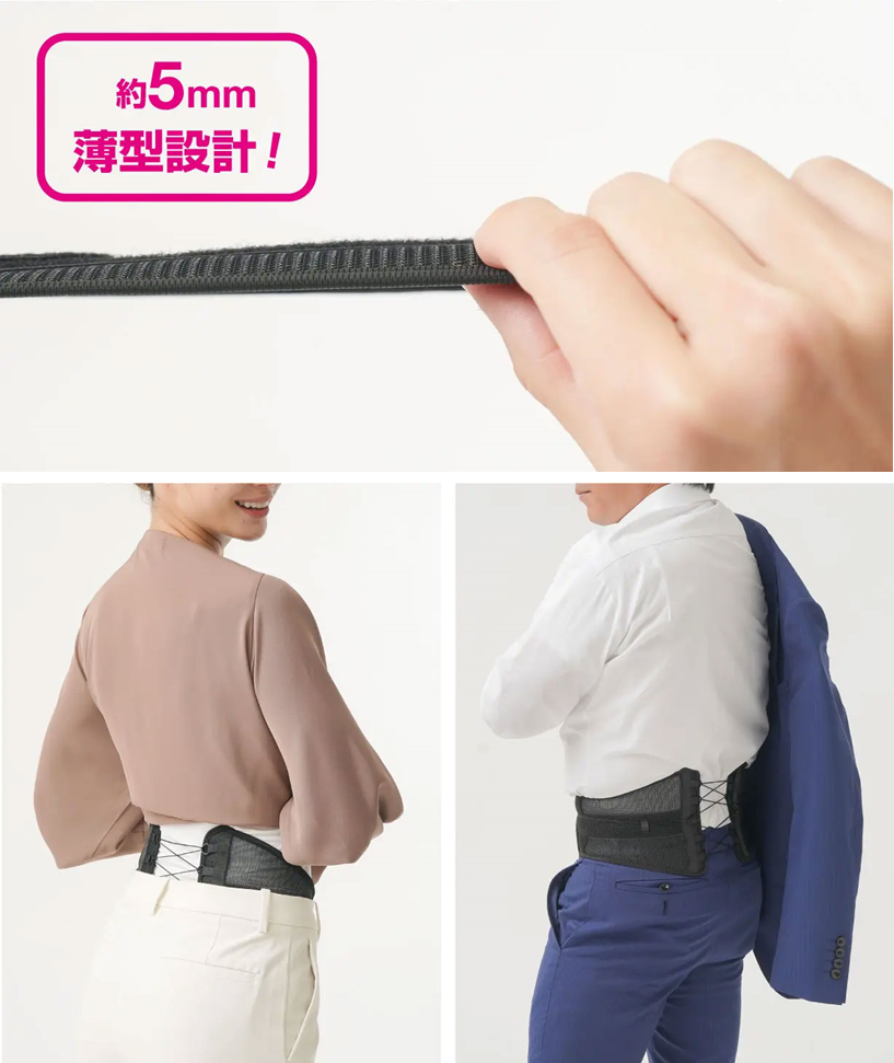前作で好評だった「薄型・軽量」「蒸れにくい」の仕様はそのままに、ワイドタイプに改良しました。その結果、腰とお腹まわりをしっかり引き締める効果が向上。腰をサポートするだけでなく、背骨を正しい位置に保ち、美しい姿勢をサポートするのに最適なデザインとなっています。