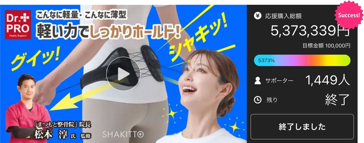 前回の「Dr.PROシャキッと腰ベルト」は5,373%の達成率、1,449人の方に応援購入いただきました!