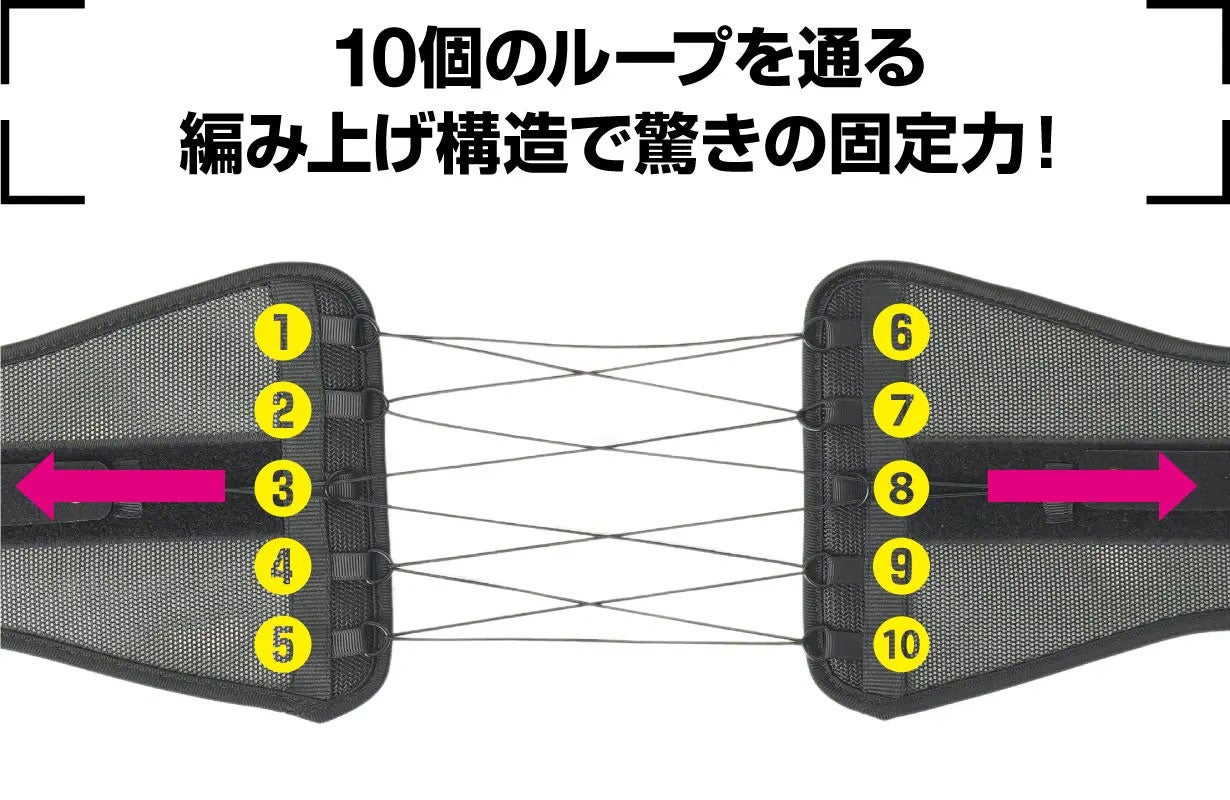 従来の腰ベルトは、緩まないようにしっかりと力を入れて締める必要がありました。しかし、「Dr.PRO シャキット腰ベルト ワイド」なら、両サイドのストラップを軽く引くだけで、驚くほどの固定力を発揮!使用しているひもは1本あたり約22kgの引っ張り強度があり、それが10本も搭載されているため、お腹に力が入ったときでも十分な強度を保ちます。